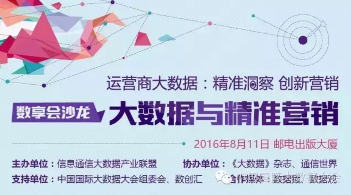 8月11日,由中国信息通信大数据产业联盟主办,《大数据》杂志、通信世界协办的“数享会:大数据与精准营销”主题沙龙将在邮电出版大厦召开,沙龙将邀请三大运营商大数据部门、互联网企业、大数据营销服务商、广告平台、移动DSP、DMP平台方、大数据技术方案商共聚一堂,交流产业趋势与合作,探讨大数据在移动营销领域的应用与创新。同时本次沙龙也将作为2016第三届中国国际大数据大会的预热活动。