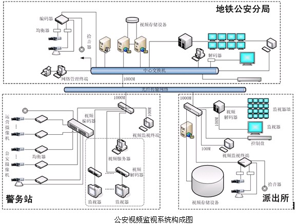 根据地铁公安管理机构的管理模式,本系统采用警务站、派出所、地铁公安分局三级监控模式,实现对1号线各车站出入口、过街通道、站台、站厅及各内控区域(接待大厅、候问室、审讯室、武器库房等地等)的治安状况的监视。
