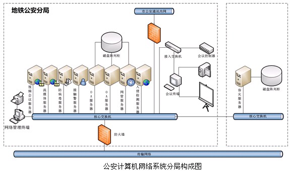 硬件需求:OA服务器,网管服务器,视频会议服务器,流媒体服务器,防病毒服务器,接处警服务器,入侵检测服务器,容灾服务器,磁盘阵列柜(1套主存、1套用于容灾)。