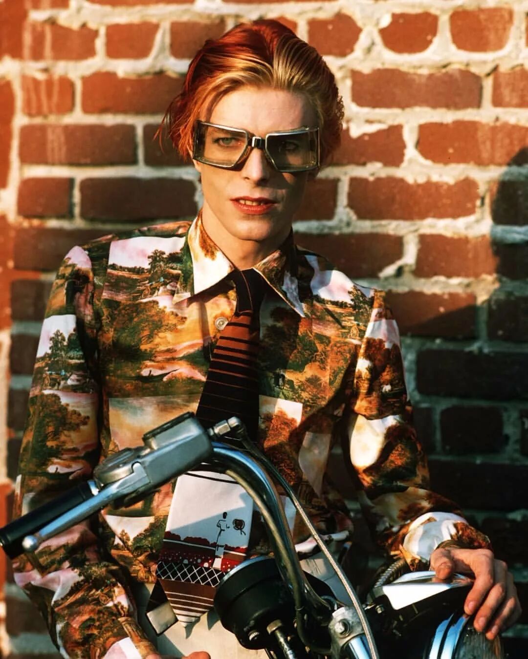 1972年,David Bowie剃掉眉毛,画上眼妆,脚踩高跟鞋,身着紧身衣,以一位太空虚拟雌雄同体生物ZiggyStardust的形象出现在大众面前。