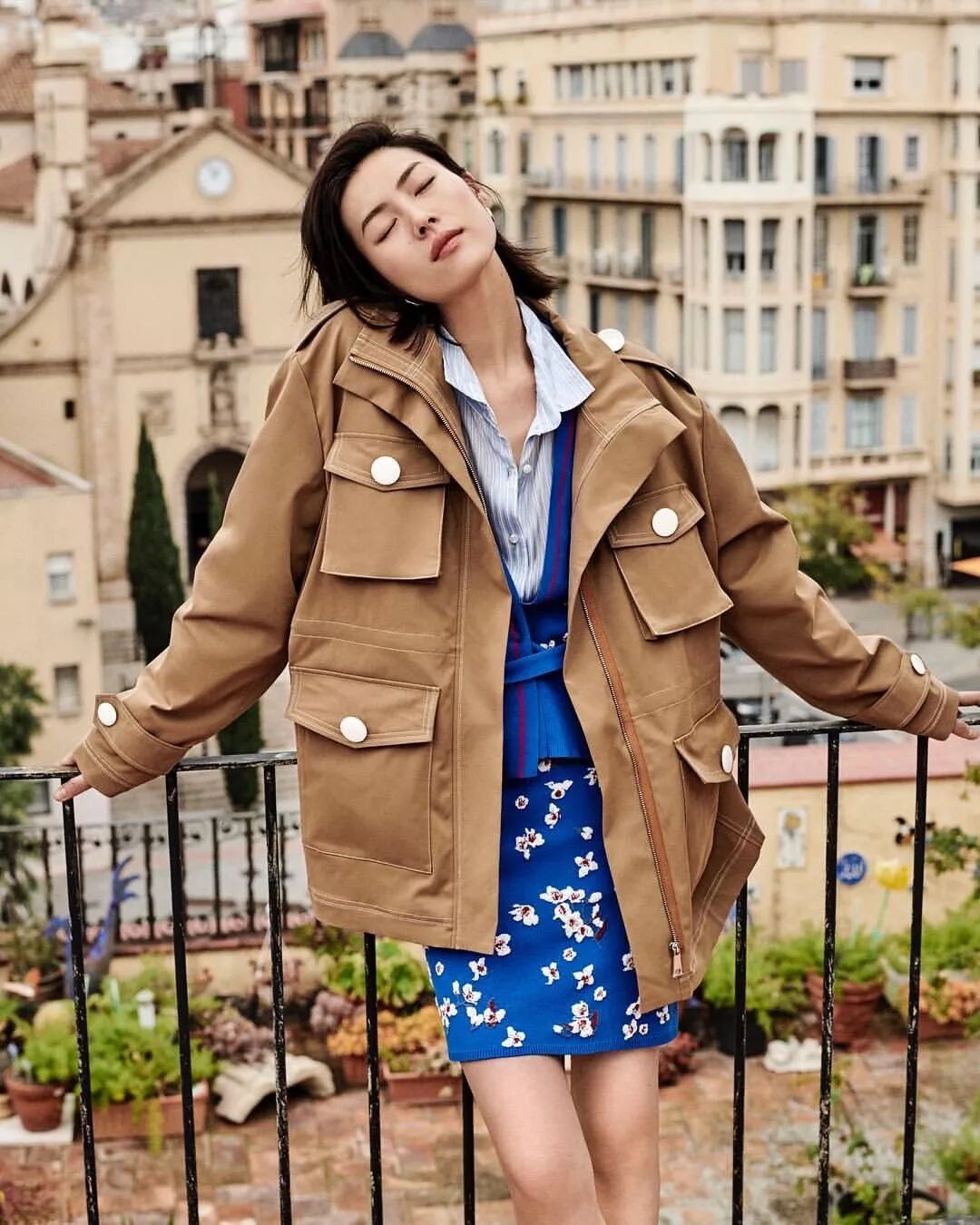首先是“行走的穿衣教科书”,大表姐刘雯引领了一种叫做“男女混穿”的时尚风格,蓝色碎花裙中和了男士工装风外套的硬朗,又酷又美,令人眼前一亮。