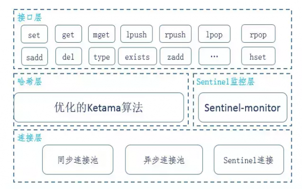 RedisSentinelClient采用了三层架构设计, 分别为连接层、哈希层和接口层,另外还有Sentinel监控层来监控Sentinel服务的存活状态。连接层包含同步连接池,异步连接池和Sentinel的连接。哈希层采用优化后的Ketama算法来做一致性hash。接口层为提供给上层用户的对Redis的key相关的操作命令,详见下图。