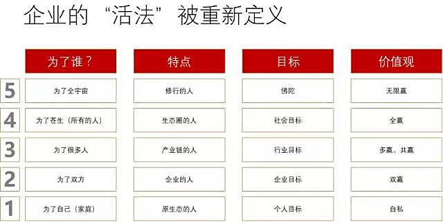 在消费者更有话语权的大数据时代,企业存在的价值会发生新的变化。过去的企业都是通过小生意发展起来的,逐渐做大,做到很大,在消费者做主导的时代,企业家就要重新思考你做企业的价值,我有五个层级的模型与大家分享,这是我对大数据时代下企业活法的思考。