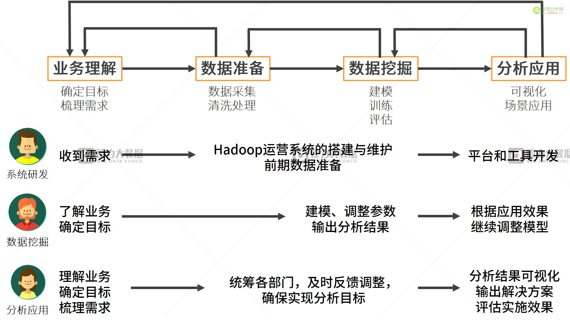 大数据业务流程有4个基本环节,分别是业务理解、数据准备、数据挖掘、分析应用。在这个流程里有三个职能领域:大数据系统研发,承担整个运营系统的构建与维护、数据准备、平台与工具开发;大数据挖掘,负责关键模型应用与研究工作;大数据分析应用:既是外部需求的接入者,也是解决方案的输出者,很多时候也会承担全盘统筹的角色。