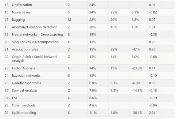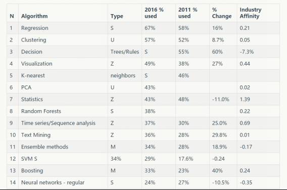 表3:KDnuggets2016调查:数据科学家使用的算法