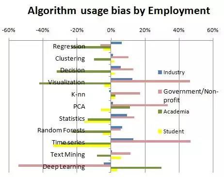 我们注意到产业界数据科学家更倾向使用回归算法、可视化、统计算法、随机森林算法和时间序列。政府/非盈利组织更倾向使用可视化、主成分分析和时间序列。学术研究人员更倾向使用主成分分析和深度学习。学生通常使用算法较少,但他们用的更多的是文本挖掘和深度学习。