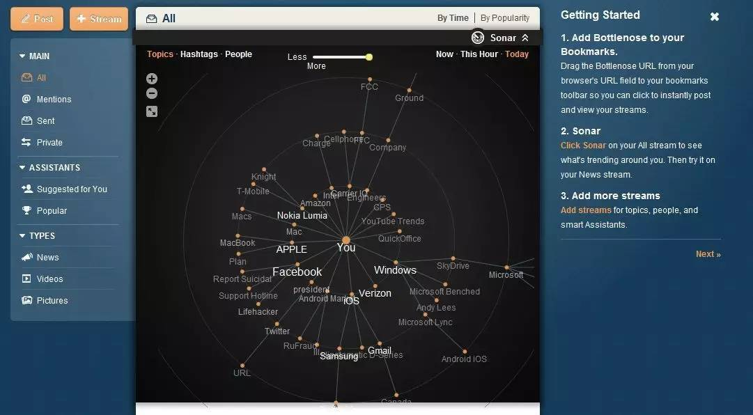 大数据可视化,则是建立在大数据分析之上的,让人们能够更加便捷的理解数据分析结果的手段。大多数提供数据可视化业务的公司都将其作为对数据分析的延伸业务,例如Bottlenose 在进行数据分析自动化业务的同时,提供对社交媒体分析的“声纳图”,能够让用户对复杂的关系及逻辑线条一目了然,提升了用户对其数据分析业务的采纳程度。