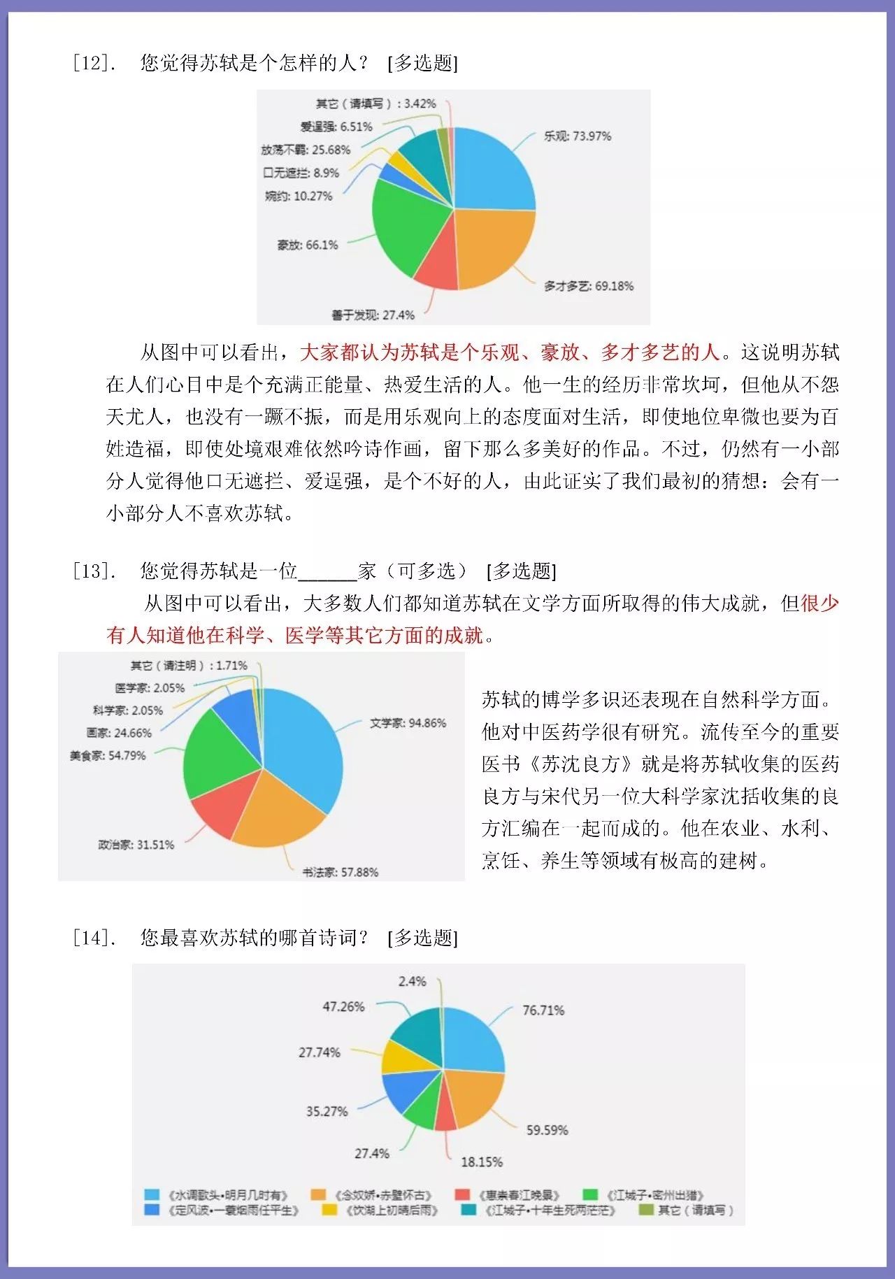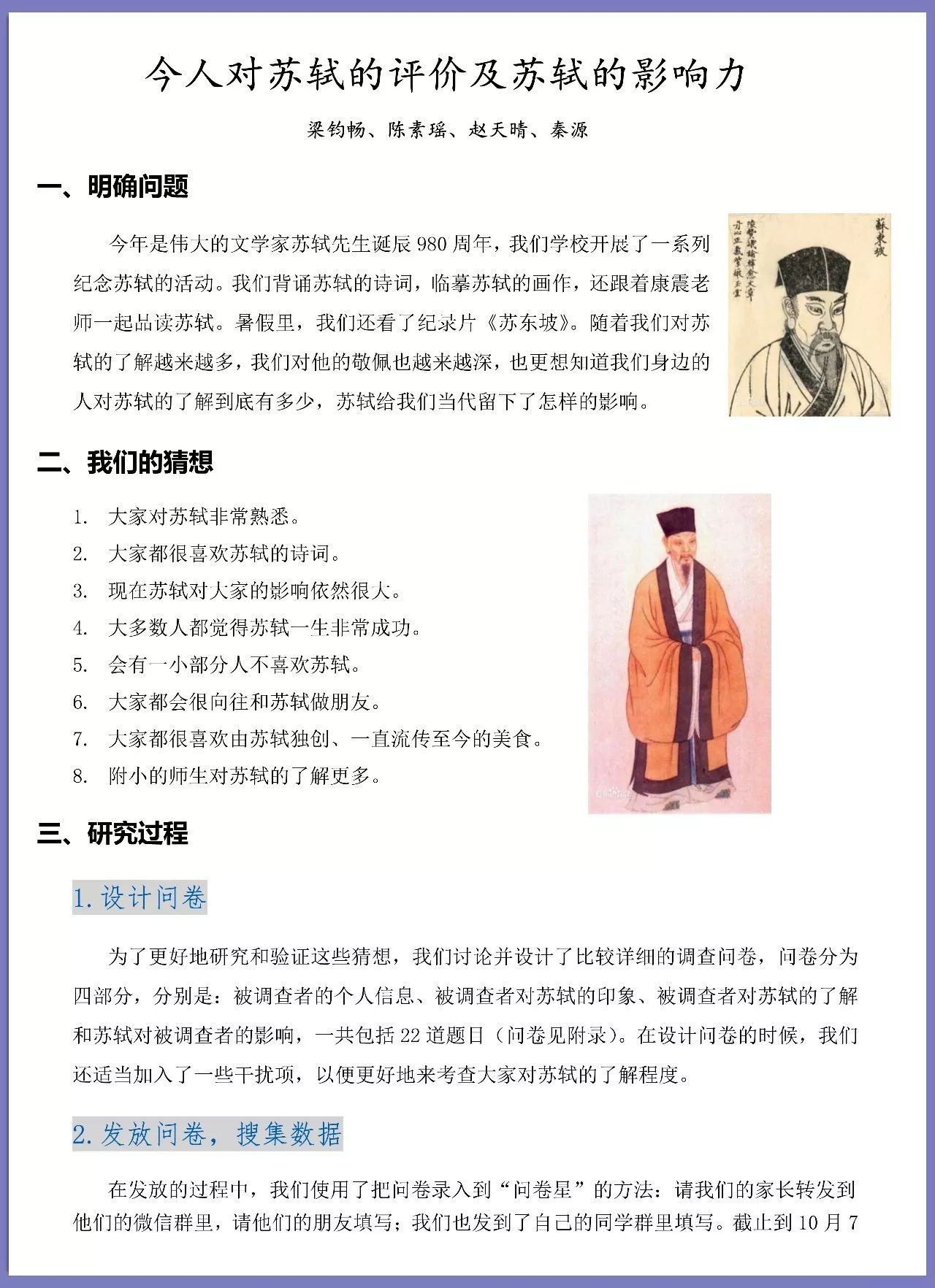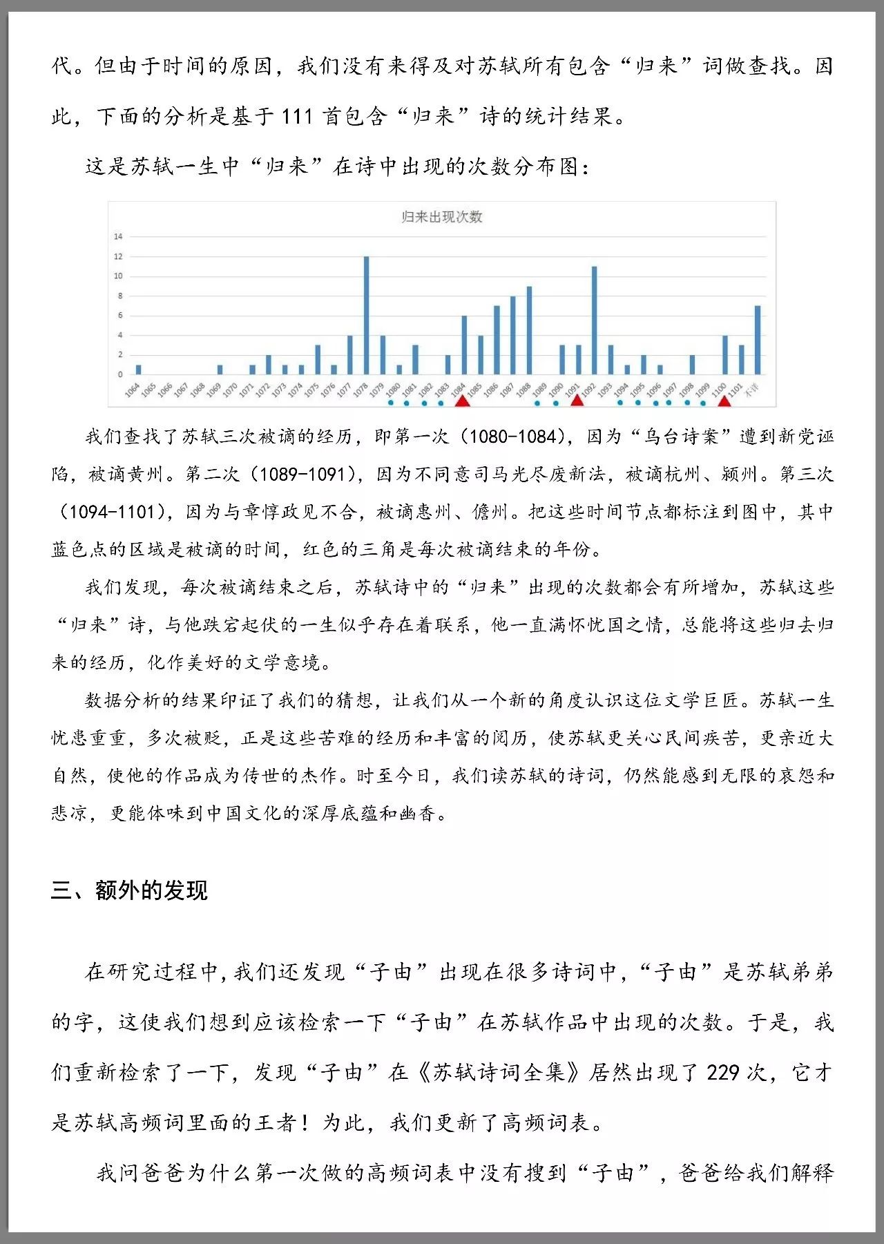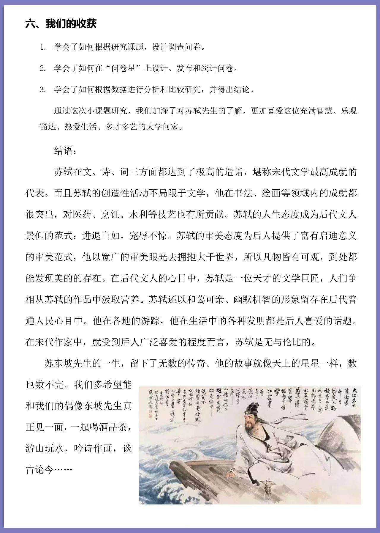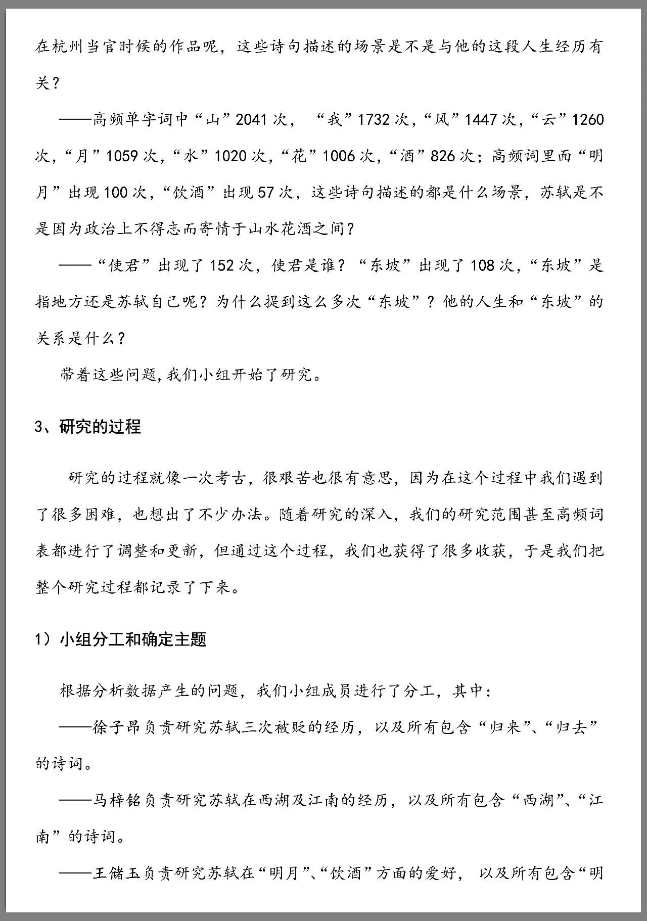 本次班级共完成课题研究报告23份,研究主题各有不同:《大数据帮你进一步认识苏轼》、《今人对苏轼的评价和苏轼的影响力》、《行走的苏轼》、《唯美景与美食不可辜负》、《苏轼的朋友圈》、《苏轼的心情曲线》、《苏轼的旅游品牌价值》、《苏轼vs李白》等等。