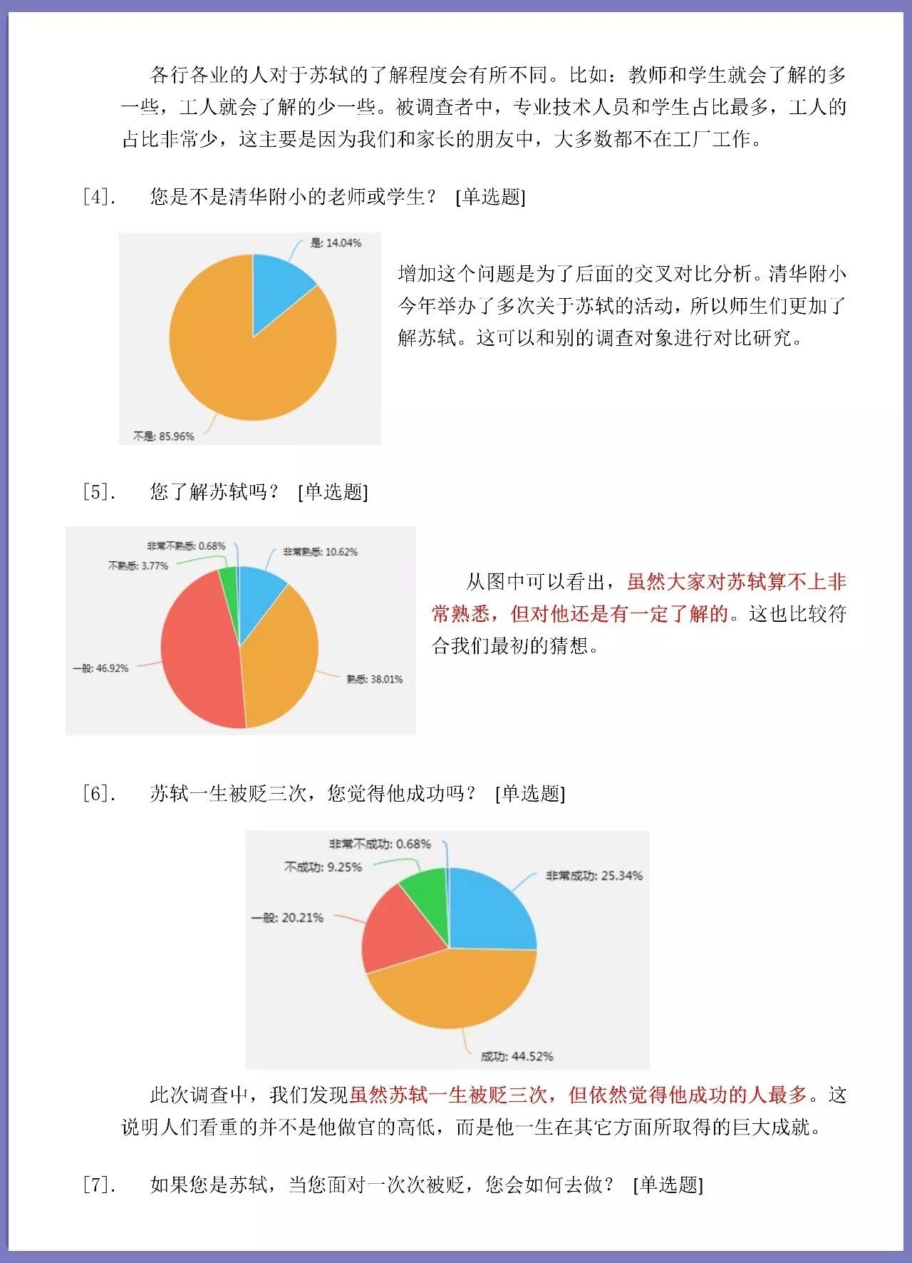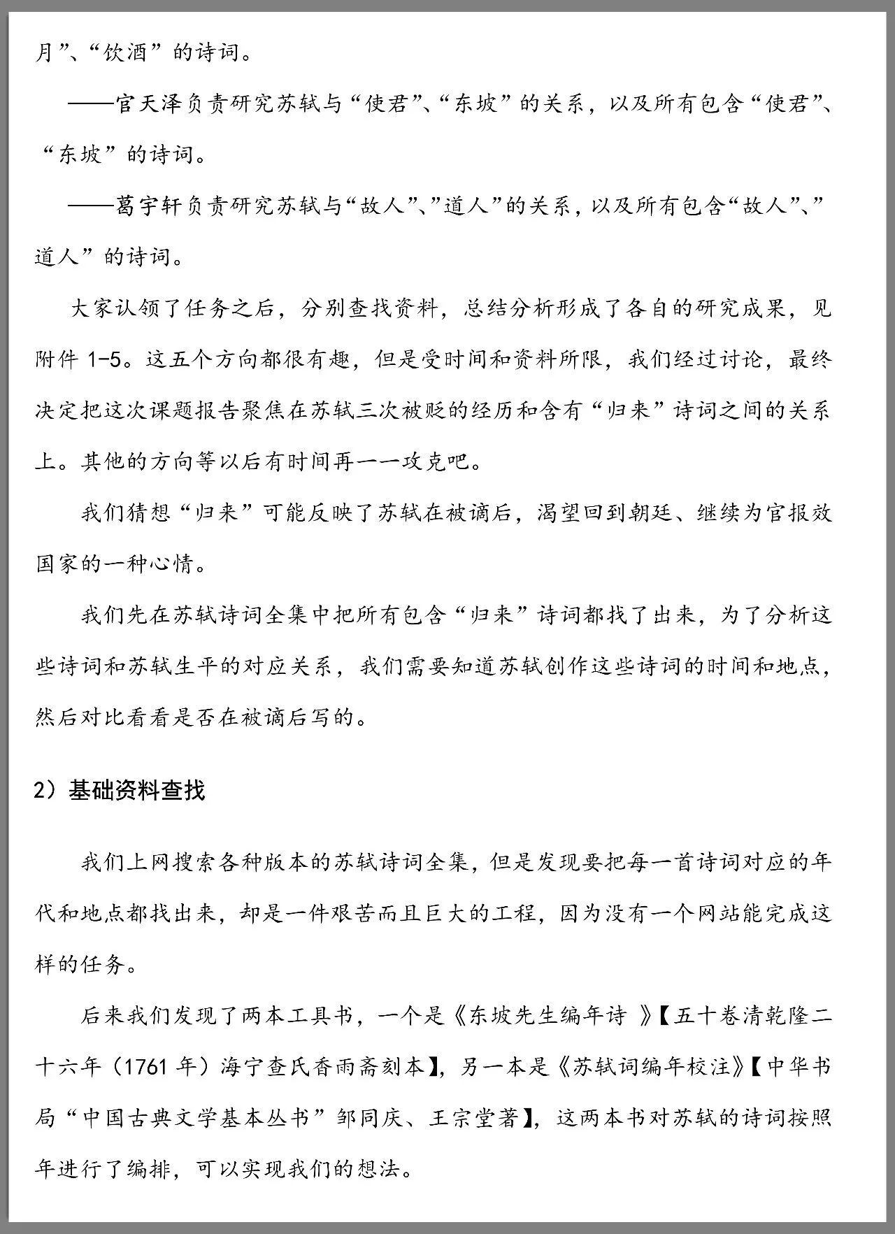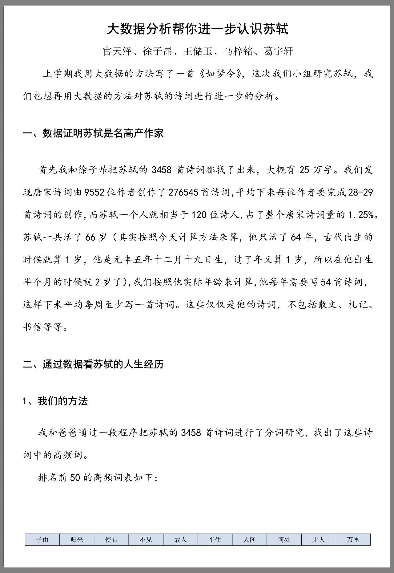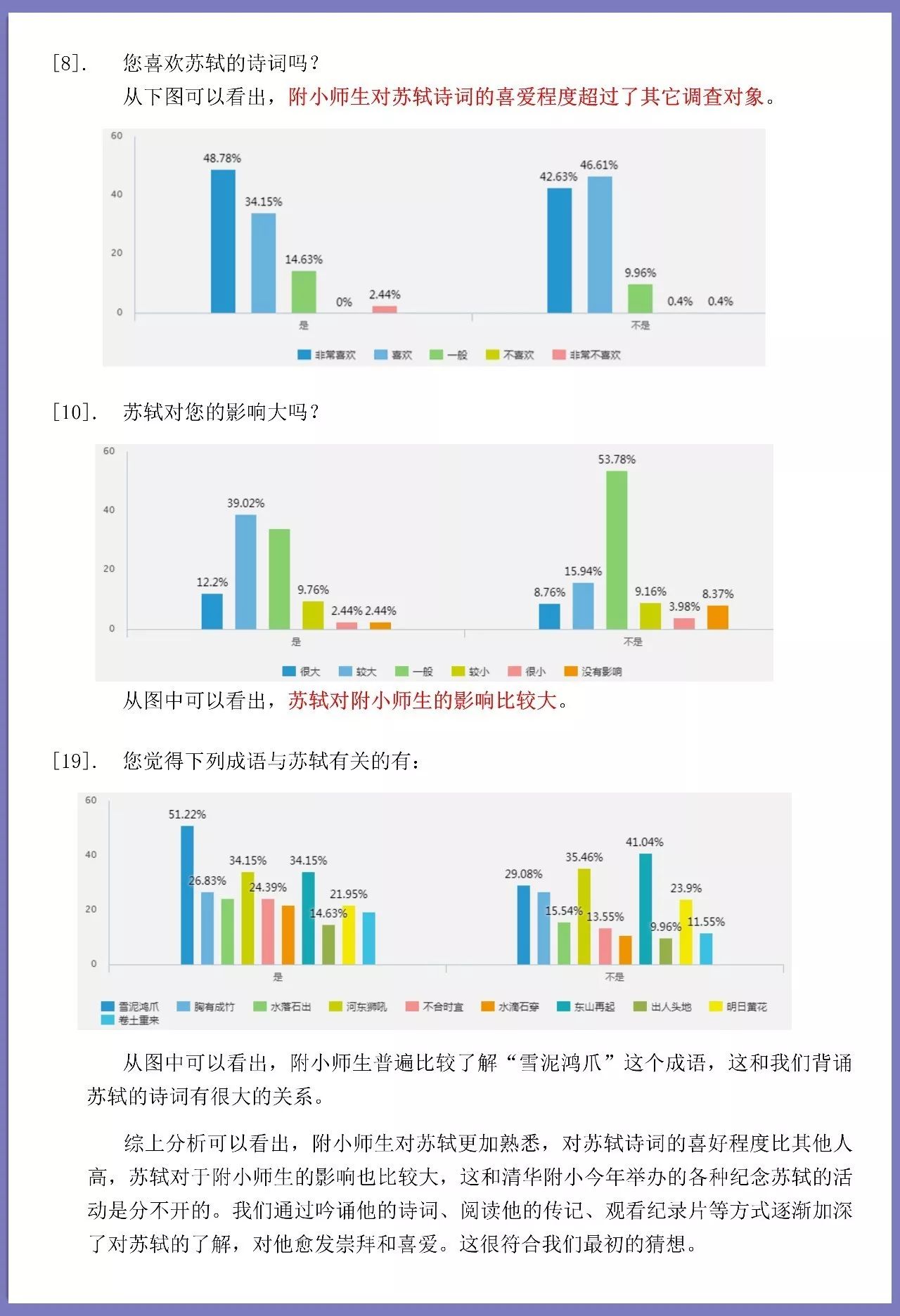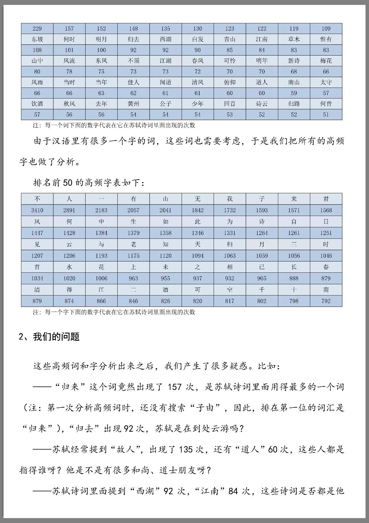 本次班级共完成课题研究报告23份,研究主题各有不同:《大数据帮你进一步认识苏轼》、《今人对苏轼的评价和苏轼的影响力》、《行走的苏轼》、《唯美景与美食不可辜负》、《苏轼的朋友圈》、《苏轼的心情曲线》、《苏轼的旅游品牌价值》、《苏轼vs李白》等等。