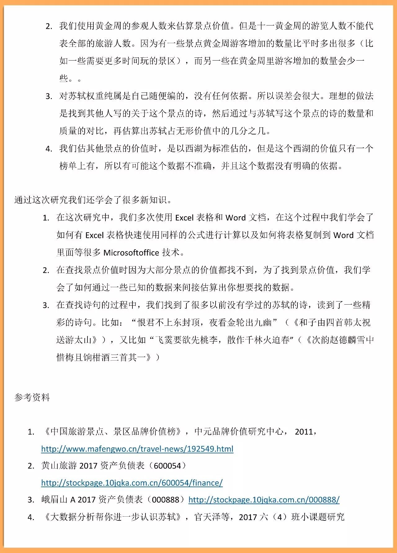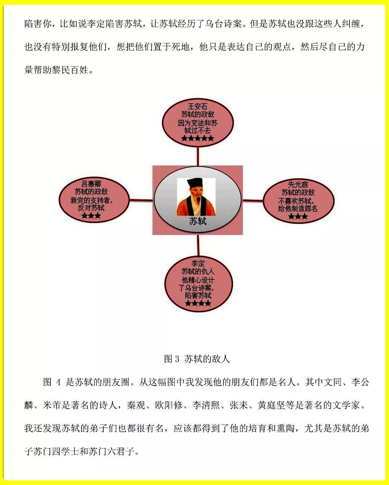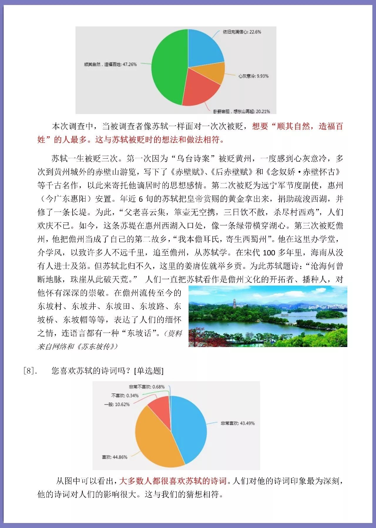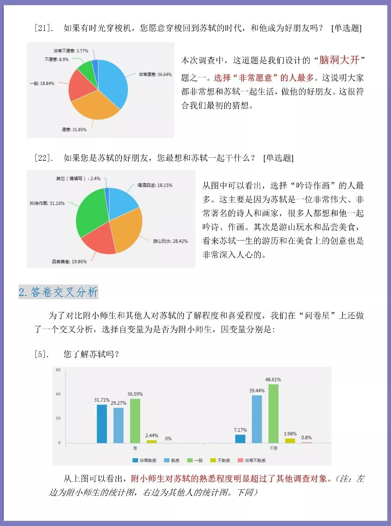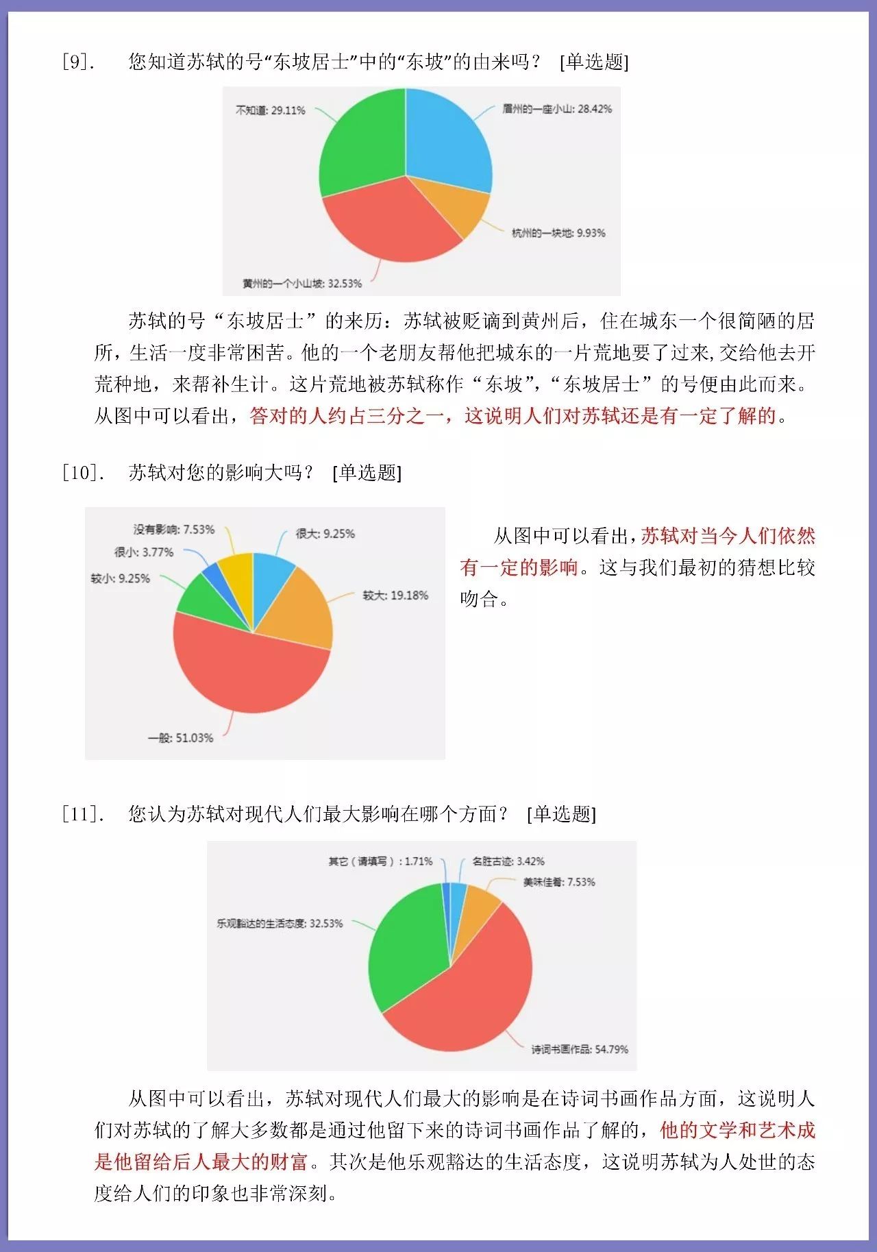 本次班级共完成课题研究报告23份,研究主题各有不同:《大数据帮你进一步认识苏轼》、《今人对苏轼的评价和苏轼的影响力》、《行走的苏轼》、《唯美景与美食不可辜负》、《苏轼的朋友圈》、《苏轼的心情曲线》、《苏轼的旅游品牌价值》、《苏轼vs李白》等等。
