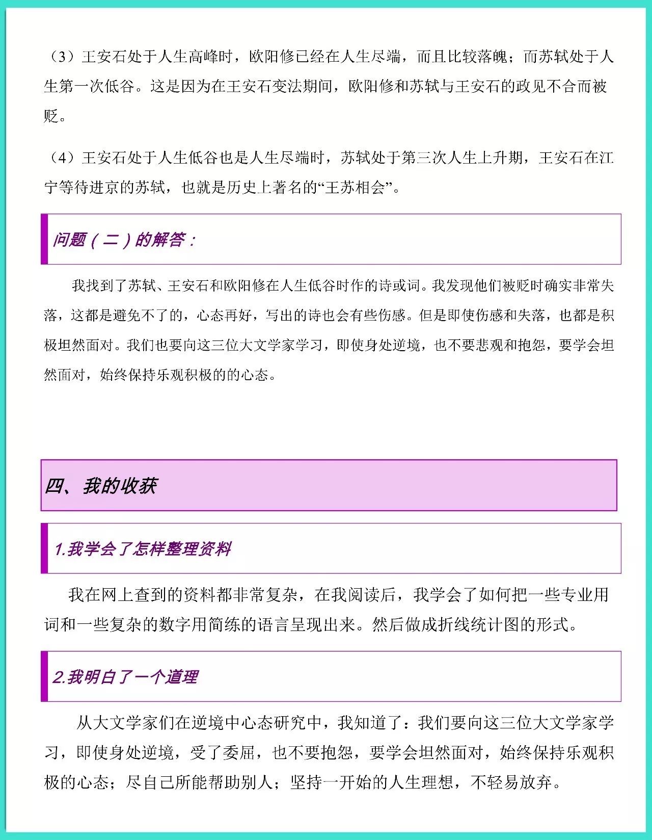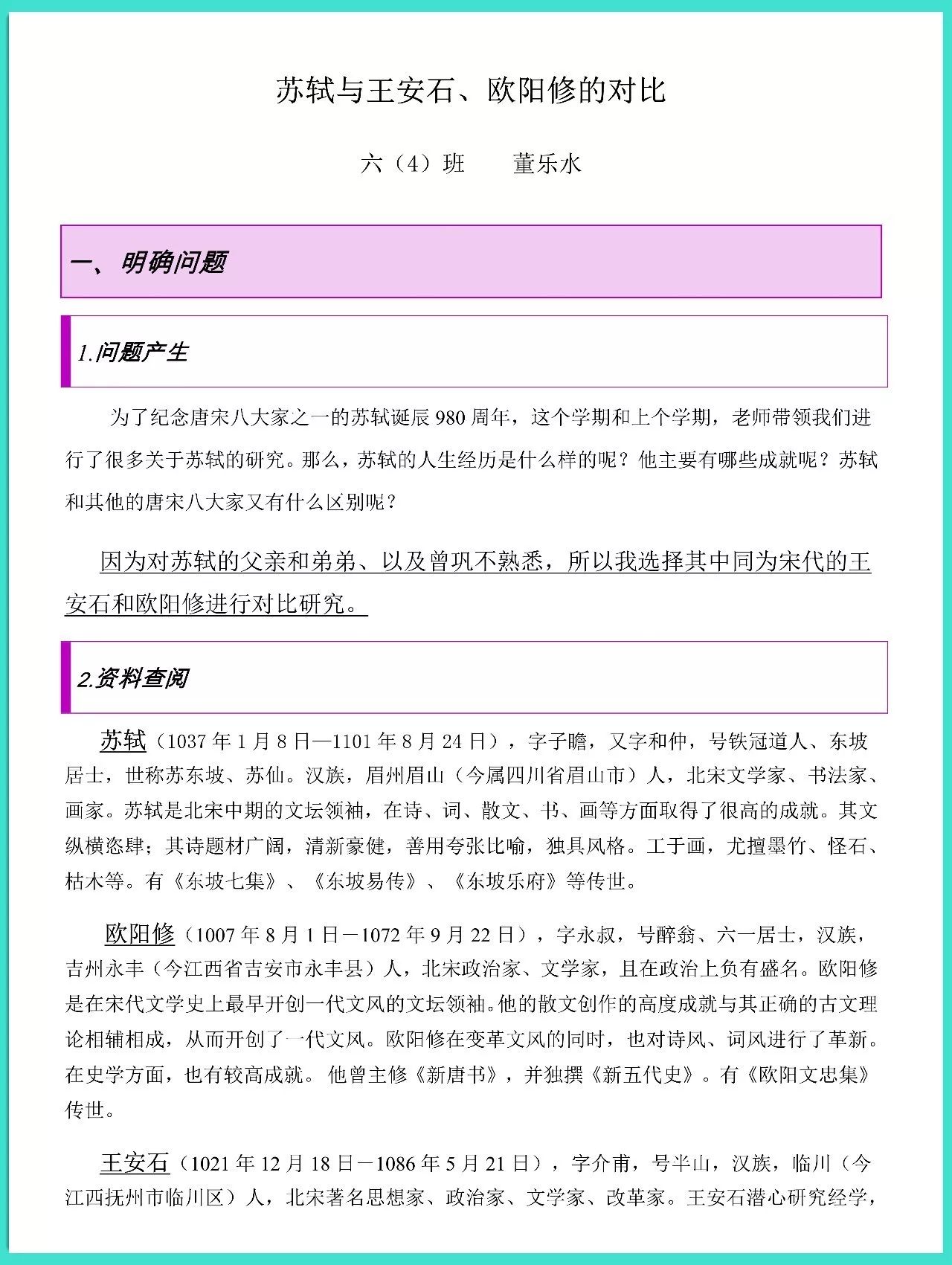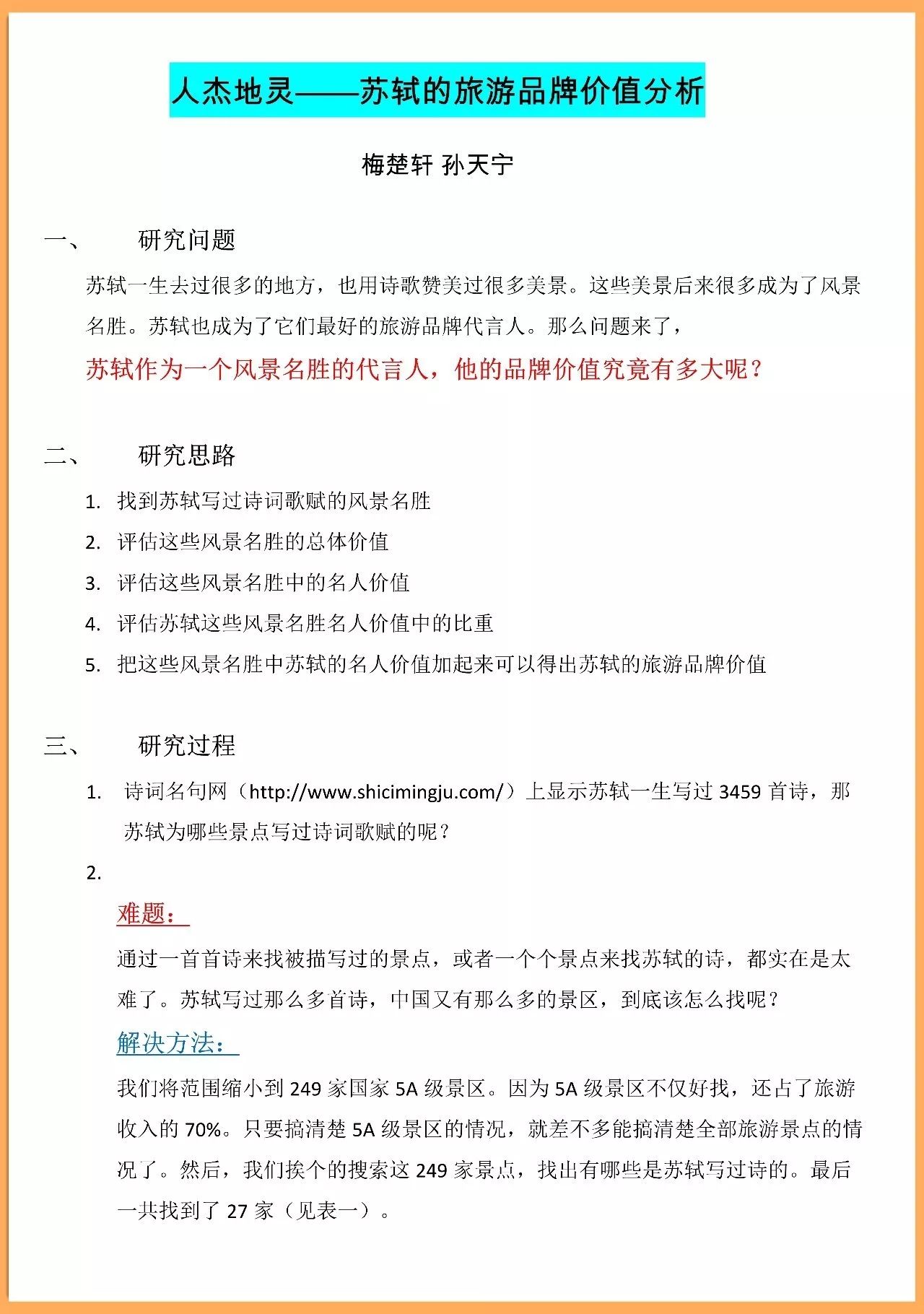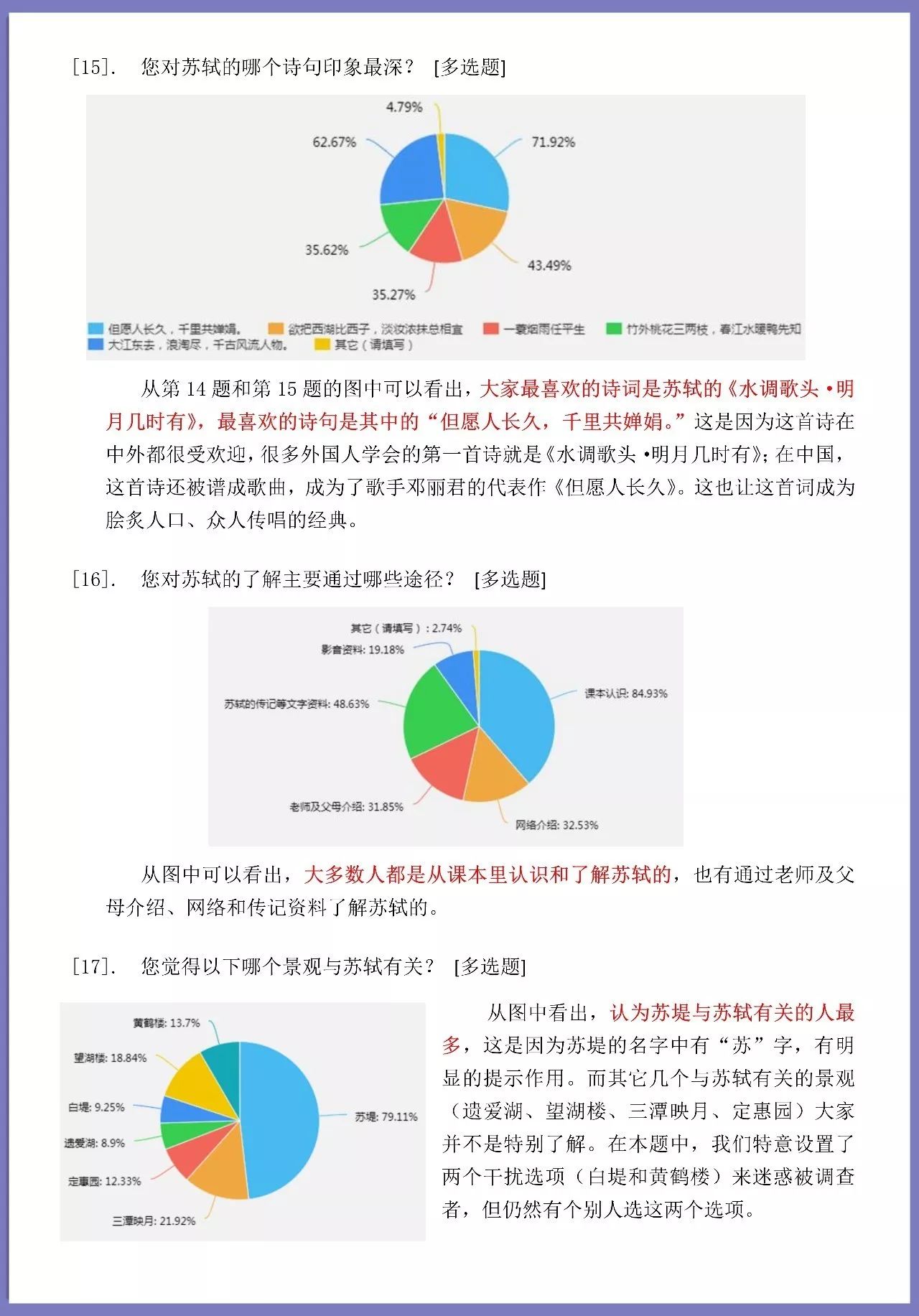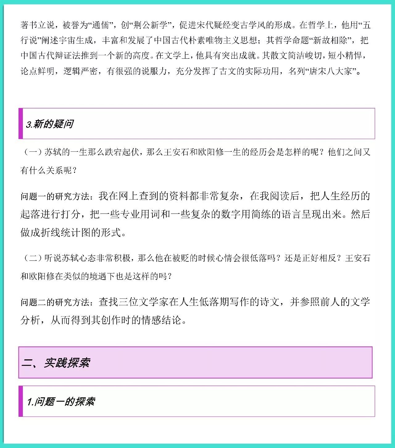 本次班级共完成课题研究报告23份,研究主题各有不同:《大数据帮你进一步认识苏轼》、《今人对苏轼的评价和苏轼的影响力》、《行走的苏轼》、《唯美景与美食不可辜负》、《苏轼的朋友圈》、《苏轼的心情曲线》、《苏轼的旅游品牌价值》、《苏轼vs李白》等等。