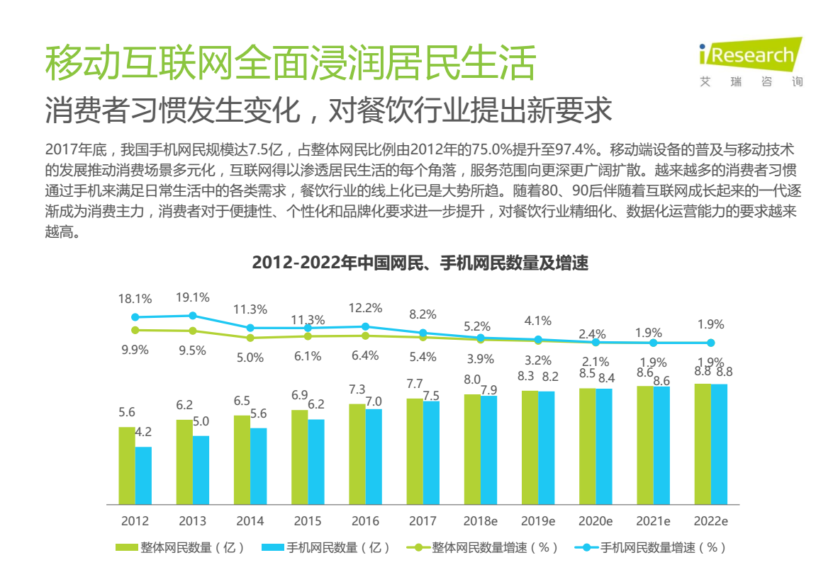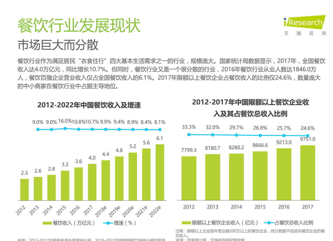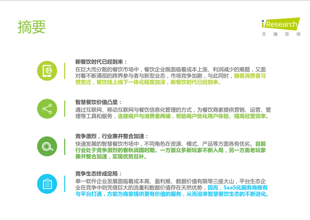 随着互联网对居民生活的渗透不断深入,餐饮行业线上线下化程度加深,新餐饮时代到来。智慧餐饮通过互联网、移动互联网与餐饮信息化管理的方式为餐饮商户提供营销、运营、管理等工具和服务,连接商户与消费者两端,帮助商户优化用户体验、提高经营效率。本报告从智慧餐饮的定义、行业发展的背景及现状、核心价值、产业链及商业模式等多个方面进行分析,综合典型企业案例研究,探讨行业发展的挑战及趋势。
