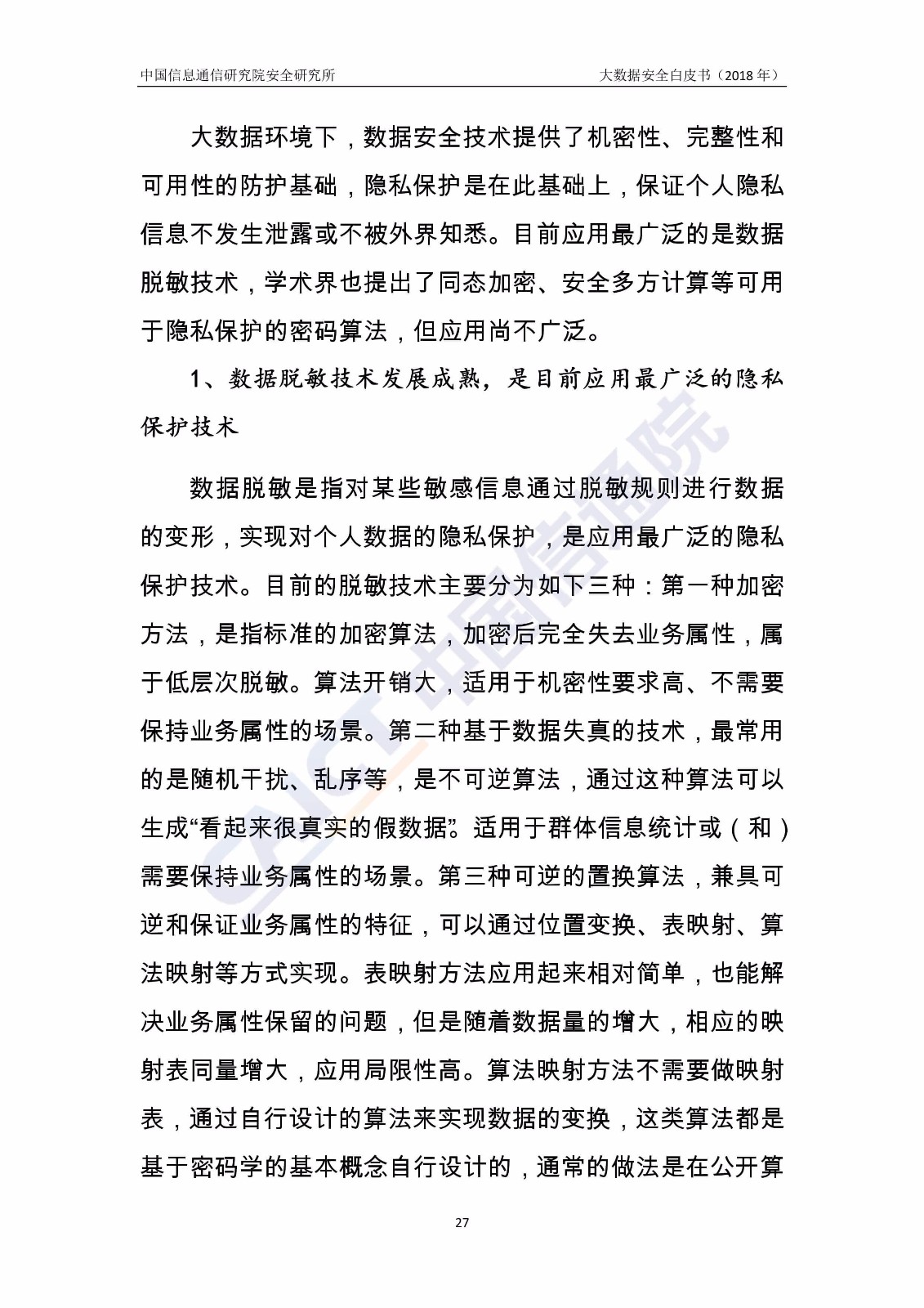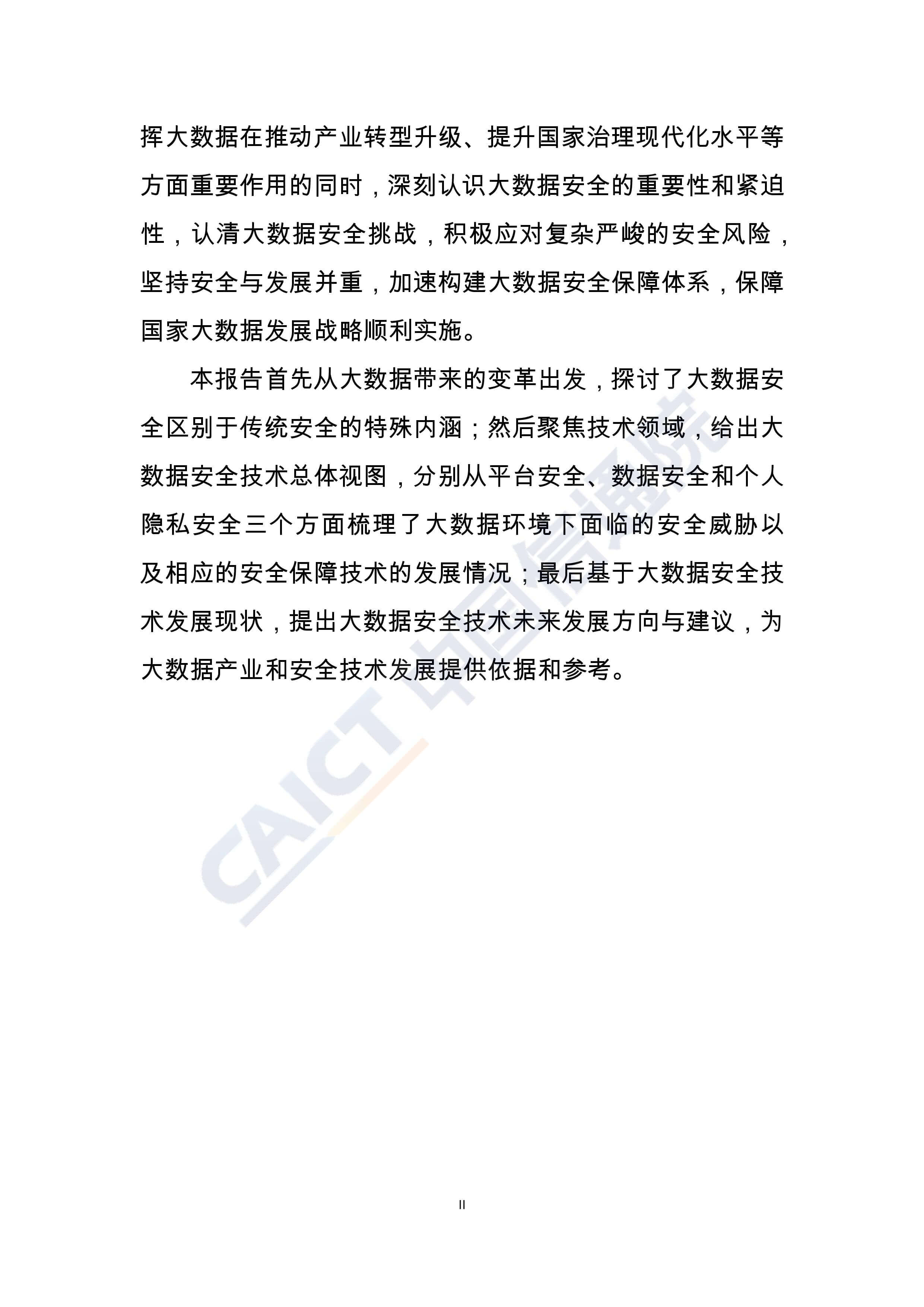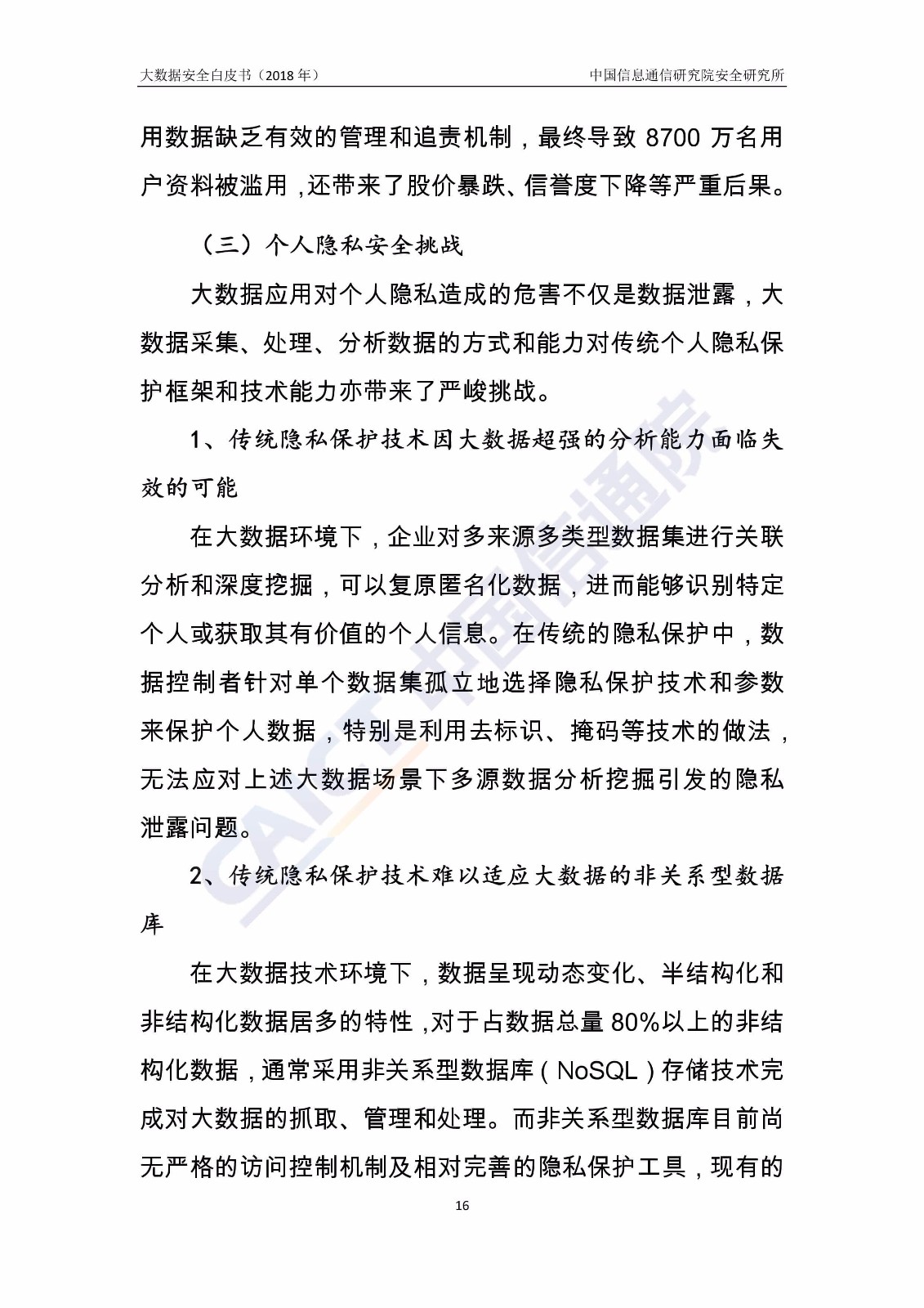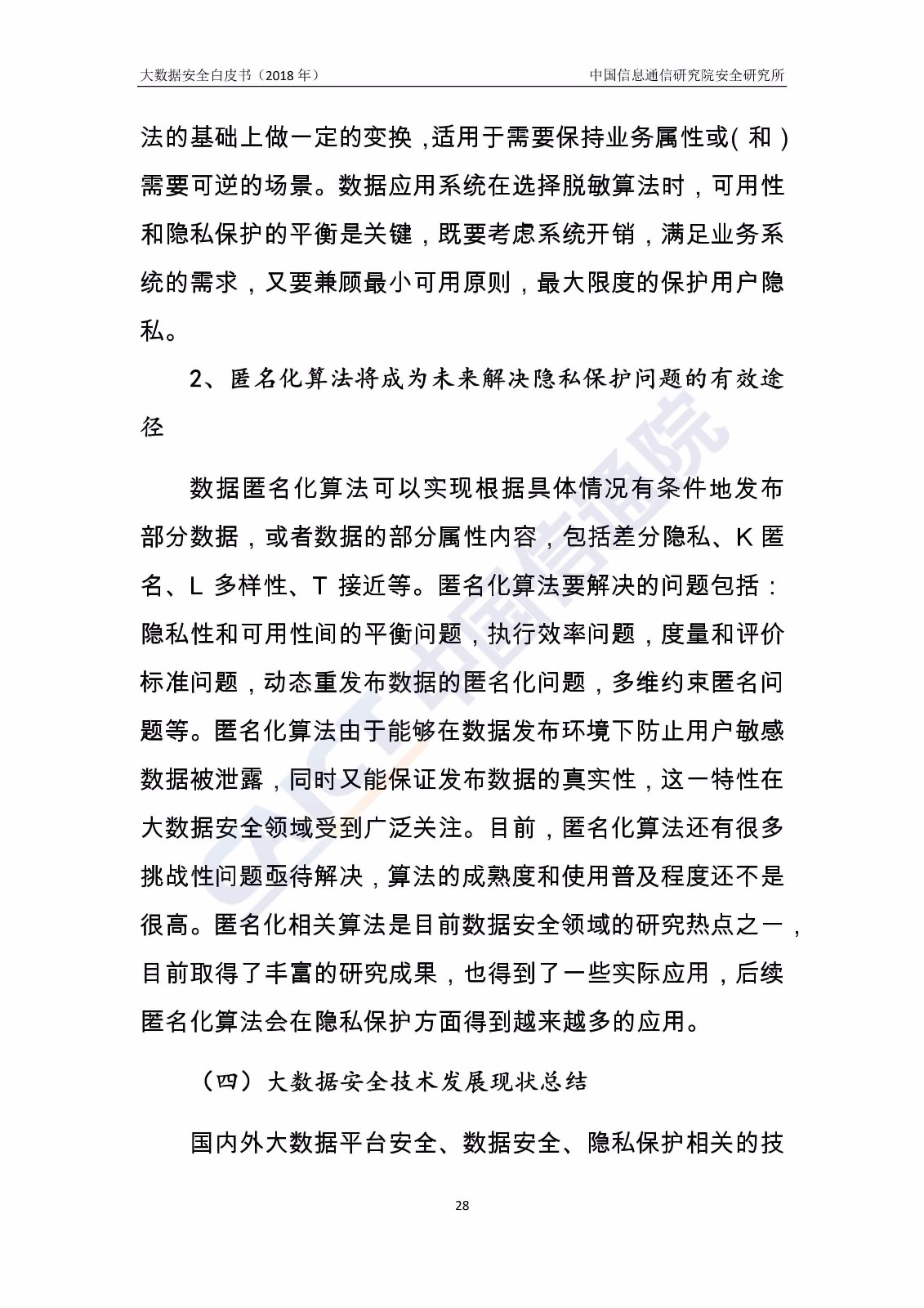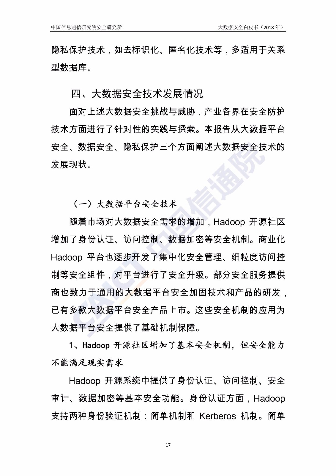 2018年7月12日,在2018中国互联网大会上,中国信息通信研究院(以下简称“中国信通院”)发布了《大数据安全白皮书(2018年)》。该书从大数据带来的变革作为出发点,探讨了大数据安全和传统安全的区别;然后聚焦技术角度,给出大数据安全技术总体视图,分别从平台安全、数据安全和个人隐私安全三个方面梳理了大数据环境下面临的安全威胁以及相应的安全保障技术的发展情况;最后基于大数据安全技术发展情况,提出大数据安全技术未来发展方向与建议,为大数据产业和安全技术发展提供依据和参考。