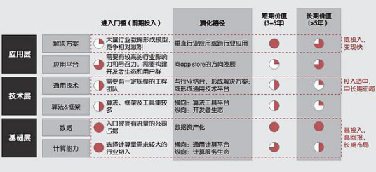 应用平台层:行业应用分发和运营平台,机器人运营平台 解决方案层:智能广告、智能诊断、自动写作、身份识别、智能投资顾问、智能助理、无人车、机器人等场景应用,人工智能产业链中,基础层是构建生态的基础,价值最高,需要长期投入进行战略布局;通用技术层是构建技术护城河的基础,需要中长期进行布局;解决方案层直戳行业痛点,变现能力最强.