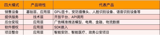 而根据商业应用类型的不同,盈利能力也有区分。解决方案是大部分公司最容易进入而且相对来说变现速度较快的部分,通过将技术应用在垂直行业或者跨行业当中实现盈利,但是竞争相对激烈,难以形成行业壁垒,在这一步拼的不仅仅只是算法能力,更多的是对深耕行业的理解、服务能力和最终产品效果,举例来说,在新零售的风口之中,很多知名的图像识别公司纷纷开始为零售商研发相应的解决方案,比如智能货柜,客流分析等等,其中旷视科技、依图科技、图普科技均是其中典型;其次就是大数据,但是大数据的进入门槛基本已经垄断在了巨头手中,像腾讯、阿里均为其中典型案例。而在技术层的通用技术和算法框架则对技术要求较高,适合中长期布局,比如图像识别公司中的商汤科技;而在基础层中的计算能力则大多也是巨头在布局。