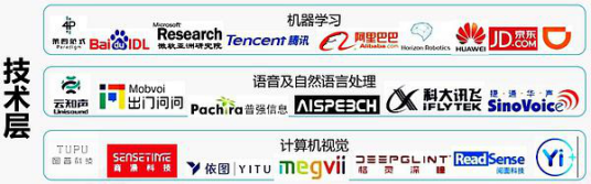 框架层:TensorFlow, Caffe, Theano, Torch, DMTK, DTPAR, ROS等框架或操作系 统 算法层:机器学习、深度学习、增强学习等各种算法 通用技术层:语音识别、图像识别、人脸识别、NLP、SLAM、传感器融合、路径规划等技术或中间件。