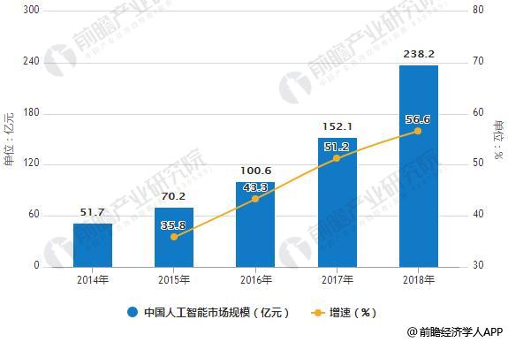 据前瞻产业研究院发布的《人工智能行业市场前瞻与投资战略规划分析报告》统计数据显示,2014年中国人工智能市场规模仅仅达到50亿元左右,到了2016年中国人工智能市场规模突破100亿元,达到了100.6亿元。2017后中国人工智能市场规模超150亿元。预计2018年中国人工智能市场规模将超过230亿元。
