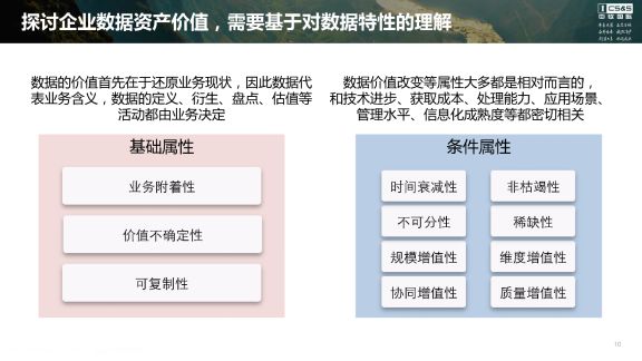右边的这些属性,较之基础属性而言称为条件属性,也可以叫做相对属性。很多文章讲数据的非枯竭性、稀缺性、规模增值性、维度增值性,我认为这些数据的特性都是相对而言,不是绝对的,因为它跟业务相关、随业务情况而改变。不同的业务场景、不同的数据处理能力、甚至信息技术进步、数据获取成本、企业信息化成熟度都会影响数据的价值表现。