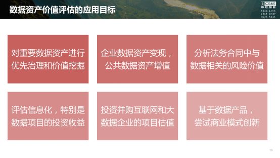 按照前面绘制的框架,我们逐一解读一下数据资产价值评估工作的各个模块。首先看评估目标。我总结归纳了六类数据资产价值的应用目标,不见得全面,只是放在这儿当个靶子。