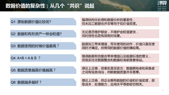 这一页的左边列出了几个当前比较多见的几个关于“数据价值”的“共识”。右边是我对这些说法的解读。举例而言,原始数据价值比较低,而经过处理的数据价值比较高,这个说法是否正确呢?我认为,这么说有其道理,实际上是在强调结构化处理和数据分析的重要性,但是未加工数据也并非等同于低价值密度。再比如,大家一般也都认同数据和有形资产一样会贬值,也有人更进一步的说,数据需要维护,否则就会贬值。的确如此,无论是否维护数据都会贬值,而不维护会贬值更快,但数据的时效性也有其场景,或者说时效性也是相对的,并不是在所有的时候数据都会随着时间的推移而贬值。
