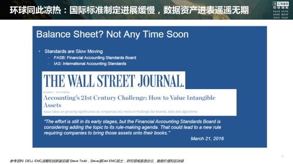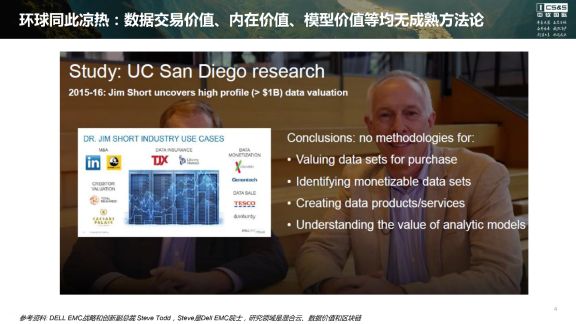 国际情况呢,也可以总结为一句话:环球同此凉热。我们看一下国外在这方面的结论:这是UCSD和戴尔EMC公司一起做的关于数据资产价值评估的一个研究,其结论是,无论在交易数据价值还是内在价值、模型价值,目前都没有成熟方法论。