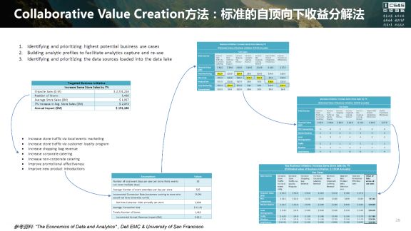 Gartner的业务价值评估方法论中的业务和经济价值评估,在现实中有几种从业务应用入手的实践。前面提到的戴尔EMC的研究使用的是协作价值生成框架法,它是从业务的战略到战略目标分解成财务的dollar value,再往下分解到不同的业务模块,然后映射到各信息化的应用,最后看不同信息化应用使用的数据,并评估数据的价值。