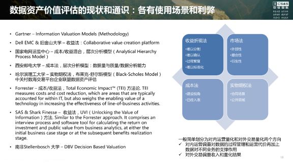 关于数据资产价值评估的方法论,业界能看得到的有这么几个。首先当然是Gartner的方法论体系,去年Gartner推出了全球首个数据资产价值评估模型。从落地角度看,目前最可以借鉴的是Dell EMC和旧金山大学做的收益法。国家电网运监中心在2015年也有一个论文,采用的层次分析模型也有一定的可参考性。