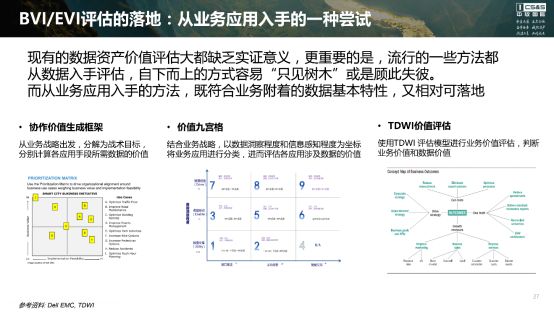 上图就是具体的操作过程,这个论文在网上大家可以下载到,我看过后有可以落地的感觉。但实际上这些大多还只是感觉,真正要落地的话绕不开主观评价和各个业务部门如何去认可你的数据,你评估的数据颗粒度大小,是到表还是到数据,等等问题。我们团队在实践中使用的价值九宫格的方法,在这里就不详述了,欢迎大家会后来交流。