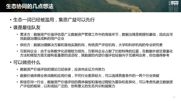 最后,我想谈一谈关于生态协同的几点想法。站在信通院的角度想,我认为今天我们谈数据资产价值评估的行业生态建设,可能要考虑两点。首先,生态建设的开始要选好队友。从需求方来看,需要找数据治理比较成熟的企业,不是他卖了多少数据,数据交易量可能是可参考的,但是可以帮助我们理论化的东西会少一点。供给方要集思广益,我们不但要有信息化解决方案商,传统资产评估机构的理论实践依然重要,当然还有大学科研机构。理想做法是真正跟大学科研机构在一起成立专门的小组,在相当长一段时间内做一些实证案例的研究,才能够真正把框架建立起来。其次,是考虑生态建设应该做些什么。数据资产价值评估的相关理论已经够多了,现在的重心应当是向实证方向努力。行业的差异非常大,所以做一个放之四海皆准的标准是不容易的,所以我建议可以做框架,也就是说告诉各个行业可以按照这样从目标到维度到模型到落地方法这样的框架去做,但是真正到每个行业标准真的挑战比较大。