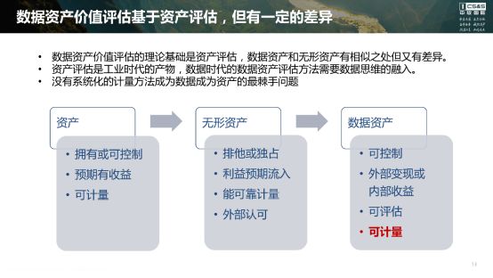 理解了数据的特性,再看数据资产。从资产到无形资产再到数据资产,三者的特性有一定的延续性,也有一定的差异。先看差异的部分:资产定义是拥有或可控制,数据资产则有意的把“拥有”二字去掉,只讲可控制,因为在更多的时候数据产生价值的前提并不是所有权。无形资产的价值需要有外部的认可,但是数据资产似乎并非如此,外部变现当然是最直接的价值体现,但内部收益并和企业外部的认可无关。在共性的部分,最重要的是可计量,我们要确定数据资产的价值就需要能够计量,而事实上,这个问题已经成为谈论数据资产的一个瓶颈。