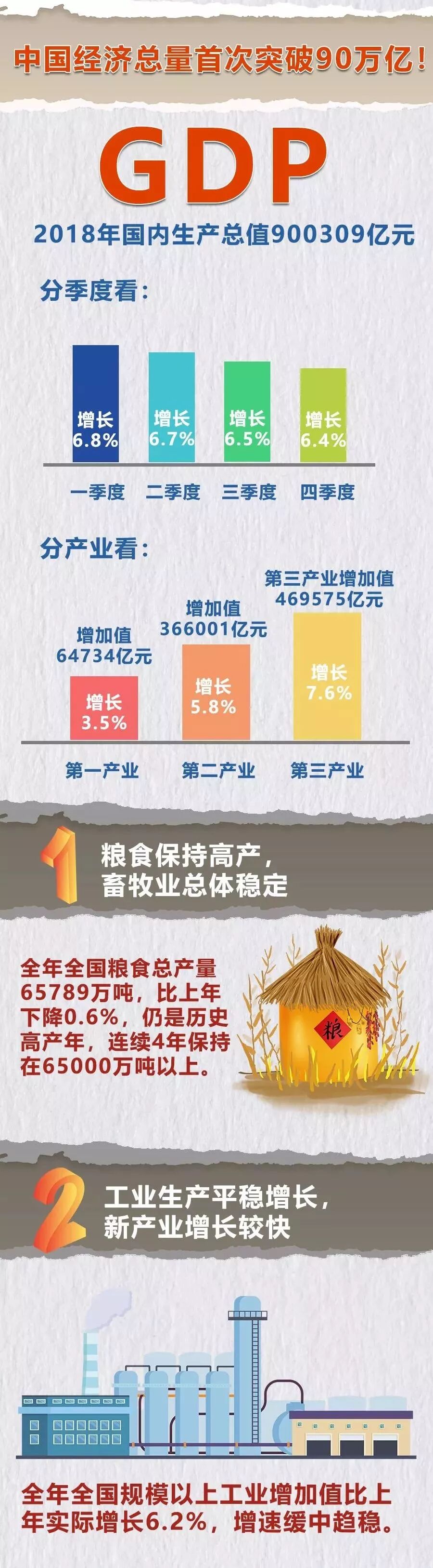 2019年1月21日上午,国家统计局发布重磅数据!初步核算,去年我国国内生产总值90.0309万亿元,中国经济总量首次突破90万亿。按可比价格计算,同比增长6.6%,完成年度计划。