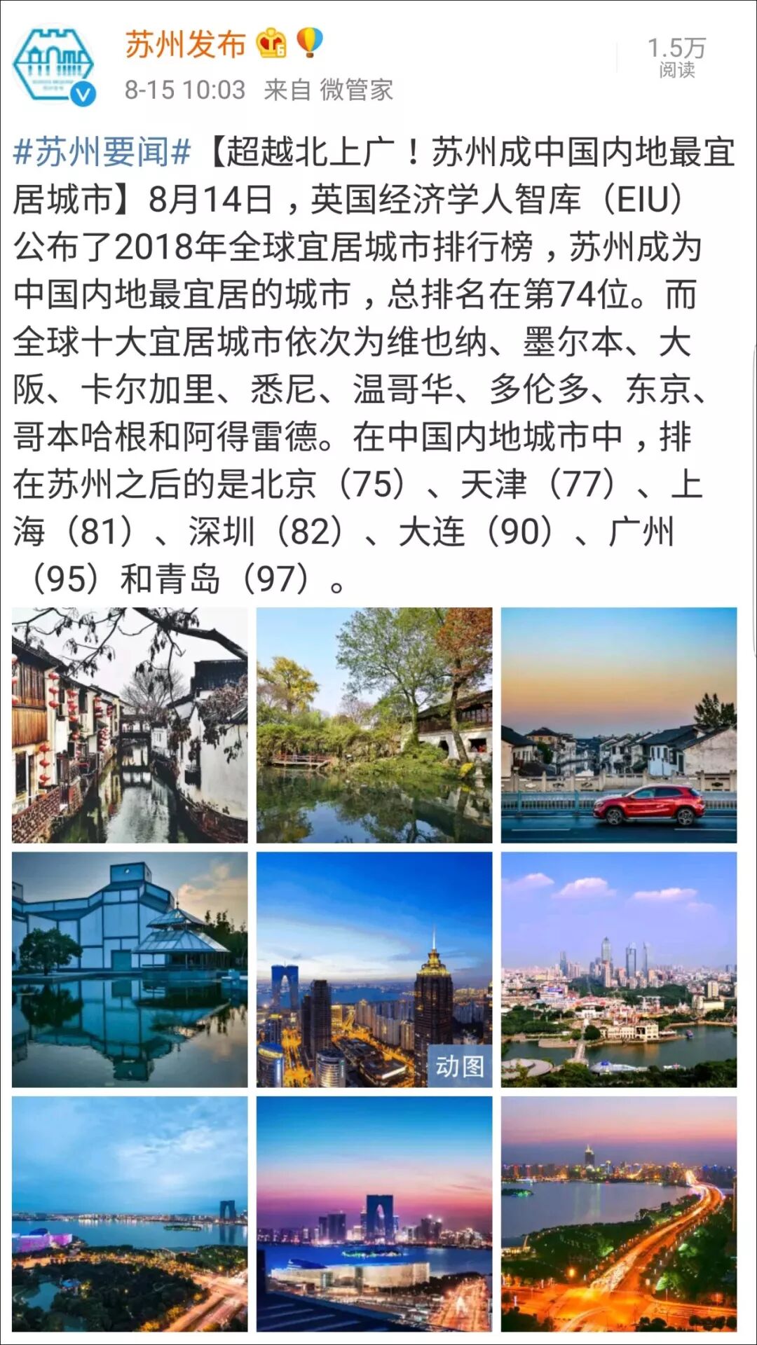 英国经济学人智库(EIU)公布的《2018年全球宜居城市排行榜》,苏州又蝉联榜首了!你没看错,是蝉联!大苏州已经连续3年,超越北上广,成为内地最宜居城市。