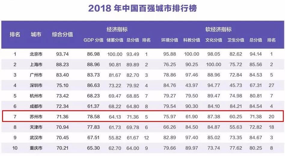 华顿经济研究院(原上海经济发展研究所)发布的“2018年中国百强城市排行榜”中,苏州以71.36的综合分值位列百强榜第7位,较去年排名上升1位,其中苏州的经济指标总分值71.36,排名全国第5位。