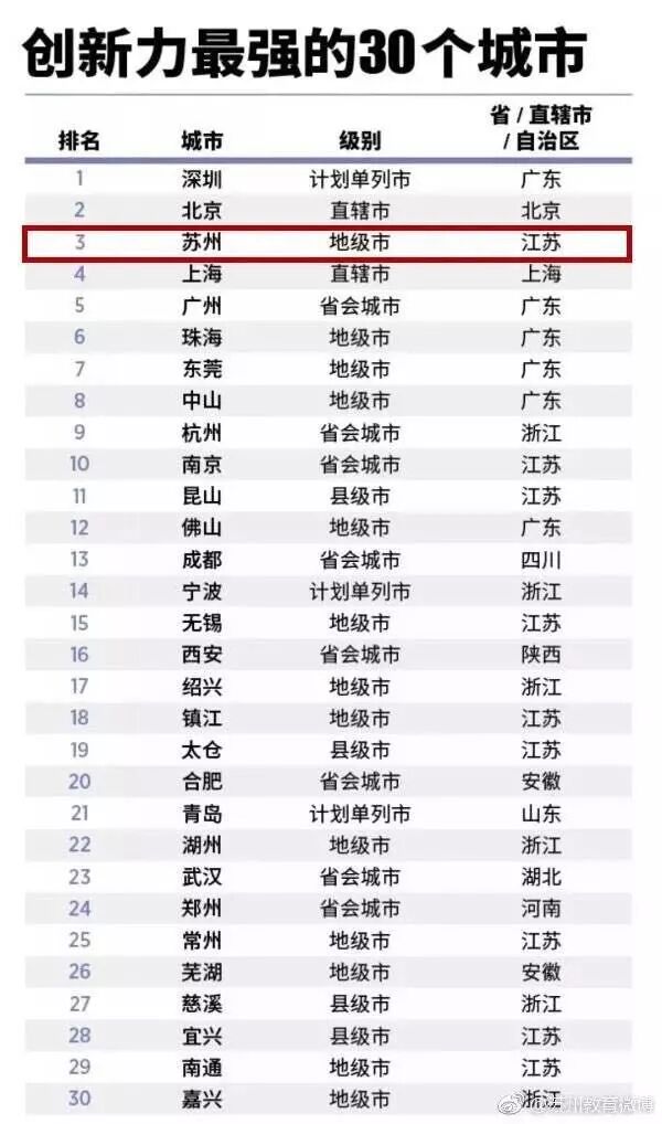 福布斯中国发布最具创新力的30个城市榜单,苏州成最大黑马,超越上海,紧随深圳、北京名列第三。
