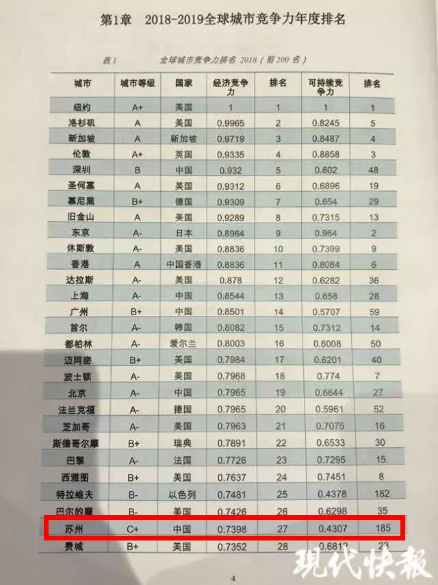在《全球城市竞争力报告2018 - 2019》中,苏州的经济竞争力排名全球第27名,在中国城市中位列第6名,仅次于香港、深圳、上海、北京,在江苏省内位居第1名。