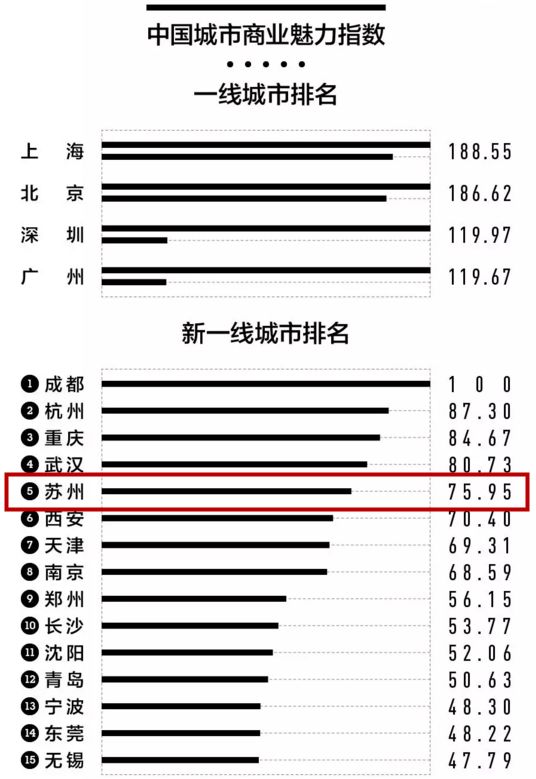 第一财经发布《2018中国城市商业魅力排行榜》,一线城市上海、北京、深圳、广州F4“北上广深”重新排名“上北深广”,新一年的15个“新一线”城市揭晓,苏州上升至第5位。