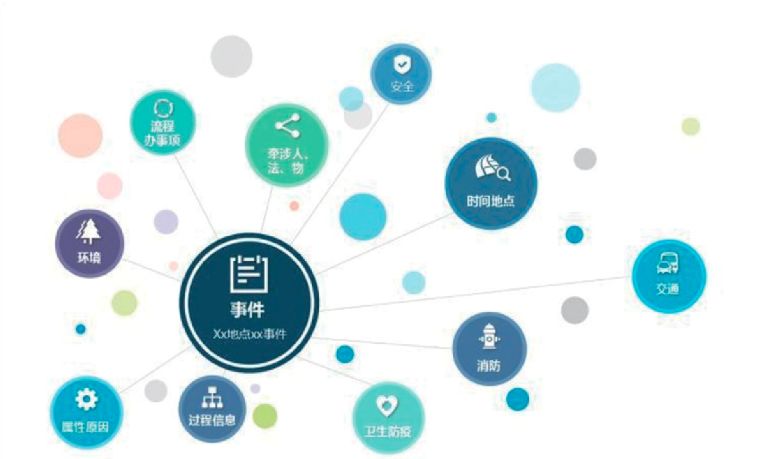 (4) 事件360, 以事件发展过程为线索的全息信息数据。该“事件”具有泛指的概念, 指所有具有时间变化特性, 围绕某一具体目标而发生的变化过程及相关信息的总和, 如办理某一行政事项, 发生某一踩踏事件, 出现某一刑事案件等。事件360涉及对该事件的前因后果, 关联的人、团体、事物的信息, 均可进行关联, 形成全方位信息。如图3所示。