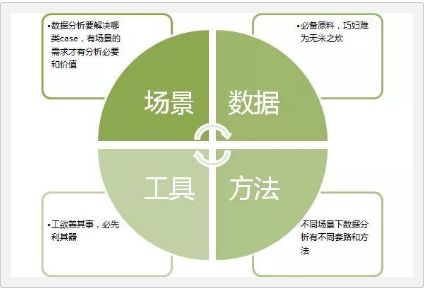 任何数据分析过程都包括四大要素:场景+数据+工具+方法,数据分析起点必须来源于某个场景下的需求,根据需求目标(场景),搭建分析框架(方法),提取需要的数据指标(数据),用适合的工具实现,最后提炼结论,给出建议或策略。