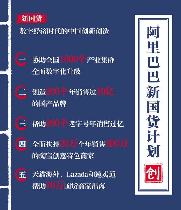 5月8日,阿里巴巴发布新国货计划:协助全国1000个产业集群全面数字化升级;创造200个年销售过10亿的国产品牌;帮助200个老字号年销售过亿;全面扶持20万个年销售500万的淘宝创意特色商家;天猫海外、Lazada和速卖通帮助70万国货商家出海。