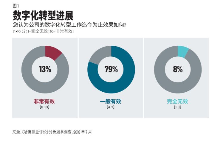 2018 年 7 月,《哈佛商业评论》分析服务对 734 名企业领导者展开的一项调查显示, 尽管已倾注多年的努力,很多组织仍在奋力实现真正的变革,只有 13% 的受访者认为其迄今为止的数字化转型工作卓有成效。