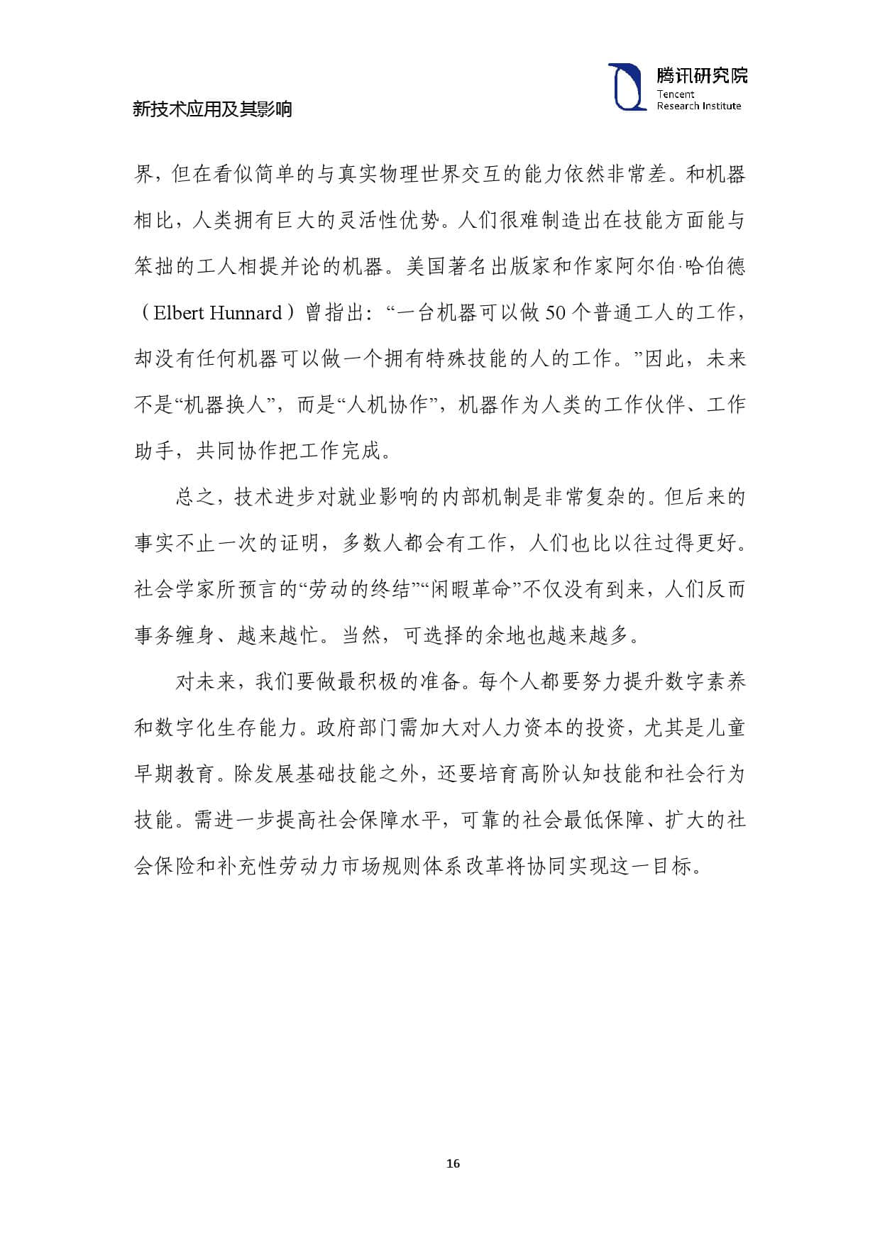 对未来,我们要做最积极的准备。每个人都要努力提升数字素养 和数字化生存能力。政府部门需加大对人力资本的投资,尤其是儿童 早期教育。除发展基础技能之外,还要培育高阶认知技能和社会行为 技能。需进一步提高社会保障水平,可靠的社会最低保障、扩大的社 会保险和补充性劳动力市场规则体系改革将协同实现这一目标。
