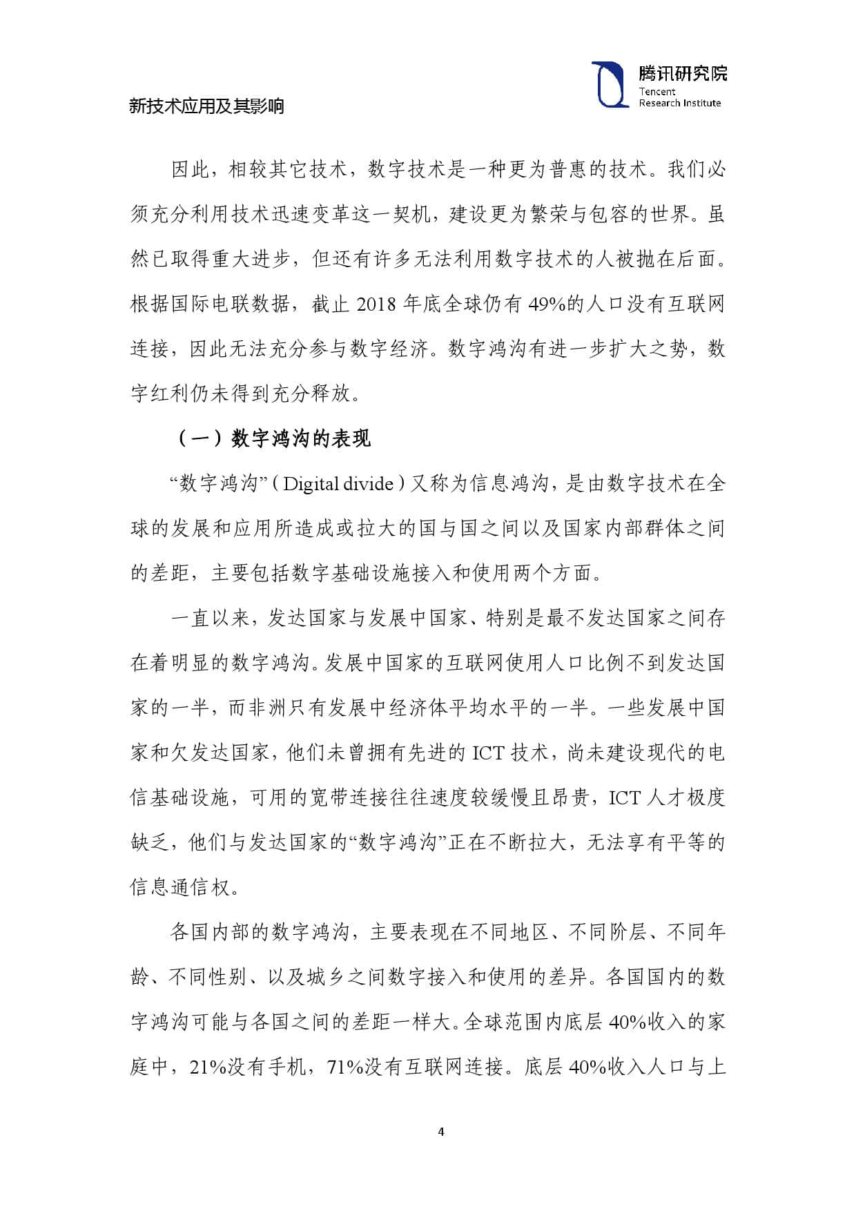 因此,相较其它技术,数字技术是一种更为普惠的技术。我们必 须充分利用技术迅速变革这一契机,建设更为繁荣与包容的世界。虽 然已取得重大进步,但还有许多无法利用数字技术的人被抛在后面。 根据国际电联数据,截止 2018 年底全球仍有 49%的人口没有互联网 连接,因此无法充分参与数字经济。数字鸿沟有进一步扩大之势,数字红利仍未得到充分释放。