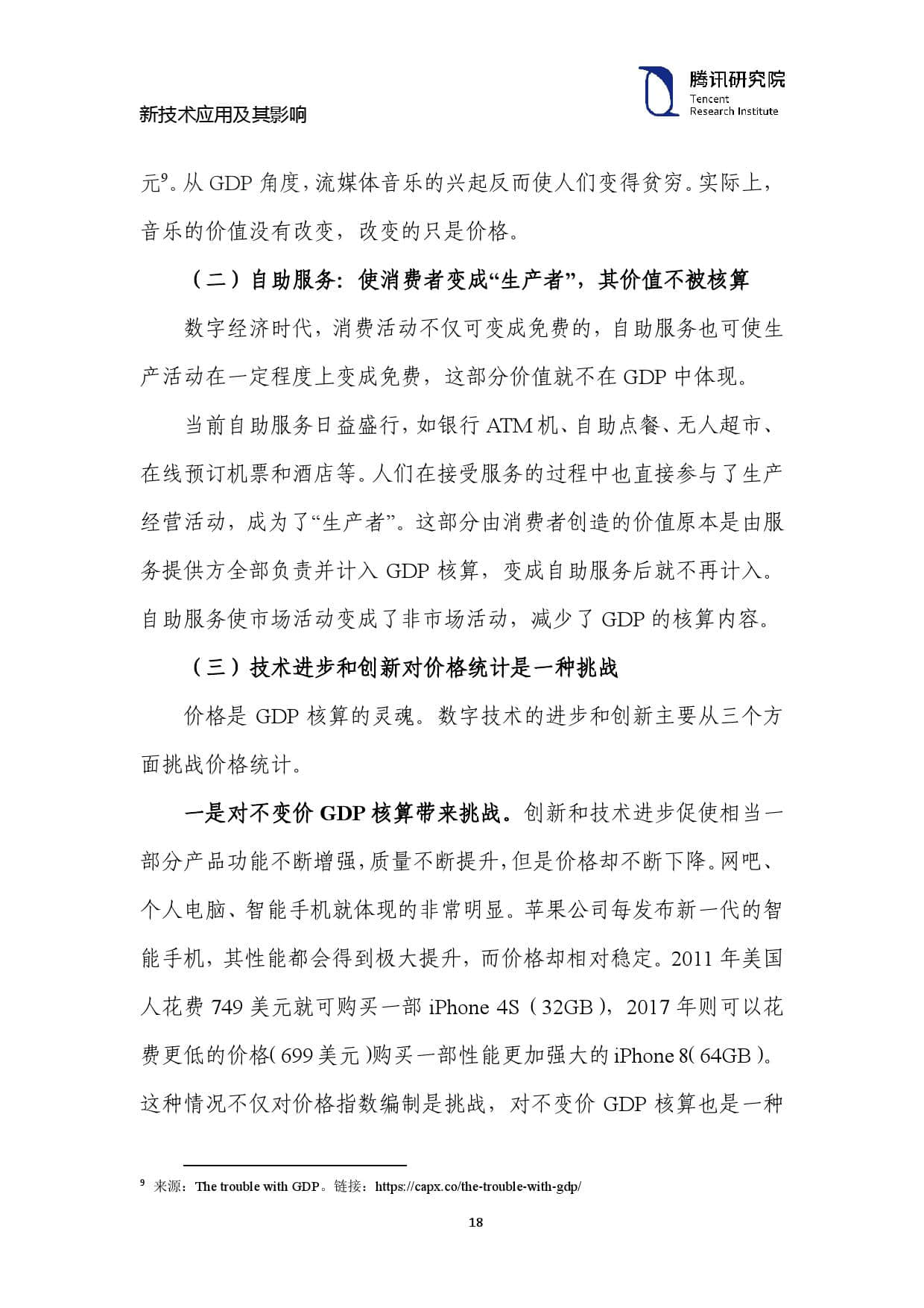一是对不变价 GDP核算带来挑战。创新和技术进步促使相当一 部分产品功能不断增强,质量不断提升,但是价格却不断下降。网吧、 个人电脑、智能手机就体现的非常明显。苹果公司每发布新一代的智 能手机,其性能都会得到极大提升,而价格却相对稳定。2011 年美国 人花费 749 美元就可购买一部 iPhone 4S(32GB),2017 年则可以花 费更低的价格(699 美元)购买一部性能更加强大的 iPhone 8(64GB)。 这种情况不仅对价格指数编制是挑战,对不变价 GDP 核算也是一种挑战。国家统计局原副局长许宪春(2017 年)指出:“现行的不变价 GDP 核算以价格指数缩减法为主,产品功能的增强和质量的提升属 于物量增长。在价格指数的编制中,如果不能准确地度量这种产品功 能的增强和质量的提升,客观地反映出纯粹的价格变化,那么不变价 GDP 核算也就难以体现出产品功能的增强和质量的提升对经济增长 的贡献。”