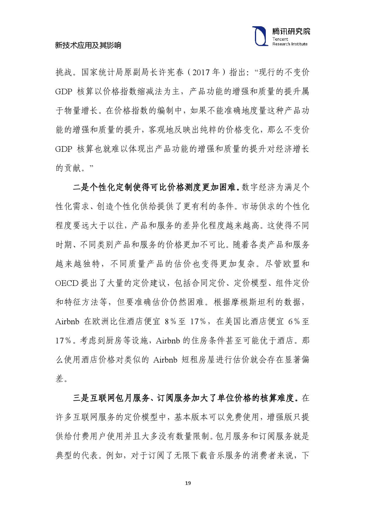 二是个性化定制使得可比价格测度更加困难。数字经济为满足个 性化需求、创造个性化供给提供了更有利的条件。市场供求的个性化 程度要远大于以往,产品和服务的差异化程度越来越高。这使得不同 时期、不同类别产品和服务的价格更加不可比。随着各类产品和服务 越来越独特,不同质量产品的估价也变得更加复杂。尽管欧盟和 OECD 提出了大量的定价建议,包括合同定价、定价模型、组件定价 和特征方法等,但要准确估价仍然困难。根据摩根斯坦利的数据,Airbnb在欧洲比住酒店便宜 8%至 17%,在美国比酒店便宜 6%至 17%。考虑到厨房等设施,Airbnb 的住房条件甚至可能优于酒店。那 么使用酒店价格对类似的Airbnb短租房屋进行估价就会存在显著偏 差。