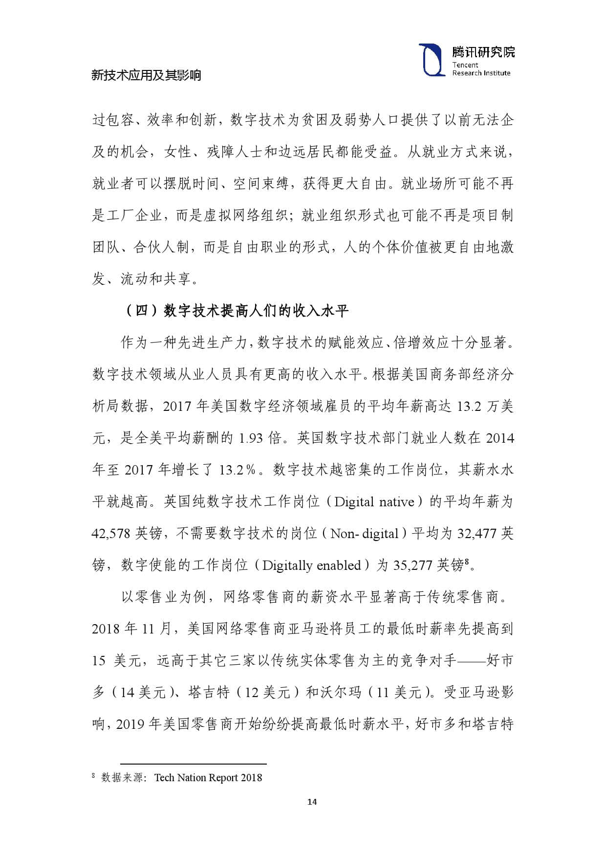 作为一种先进生产力,数字技术的赋能效应、倍增效应十分显著。 数字技术领域从业人员具有更高的收入水平。根据美国商务部经济分 析局数据,2017 年美国数字经济领域雇员的平均年薪高达 13.2 万美 元,是全美平均薪酬的 1.93 倍。英国数字技术部门就业人数在 2014 年至 2017 年增长了 13.2%。数字技术越密集的工作岗位,其薪水水 平就越高。英国纯数字技术工作岗位(Digital native)的平均年薪为 42,578 英镑,不需要数字技术的岗位(Non- digital)平均为 32,477 英 镑,数字使能的工作岗位(Digitally enabled)为 35,277 英镑。