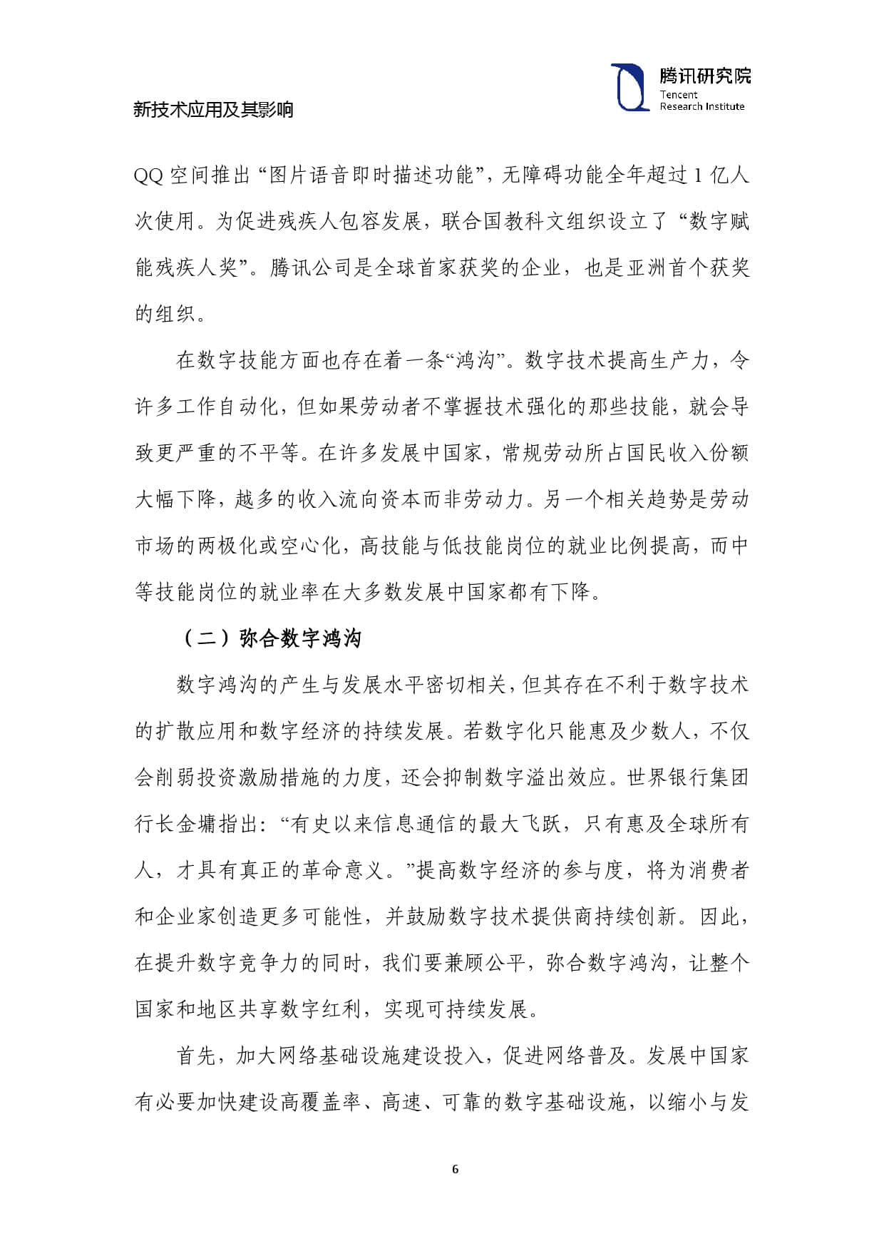 残障人士在生活和工作中已有极大不便。在数字时代,人们更要 积极作为,通过数字技术为残疾人创造合理便利条件,弥合“数字鸿 沟”。腾讯秉持“科技向善”的理念,努力让所有人能平等、方便、无障 碍地获取并利用信息,多款产品已针对残障用户进行优化。例如,手 机 QQ已实现 2425 个无障碍特性,开发出声纹加好友、QQ 表情读 取、语音发红包等创新功能,无障碍功能全年超6000万人次使用; QQ 空间推出“图片语音即时描述功能”,无障碍功能全年超过 1 亿人 次使用。为促进残疾人包容发展,联合国教科文组织设立了“数字赋 能残疾人奖”。腾讯公司是全球首家获奖的企业,也是亚洲首个获奖 的组织。