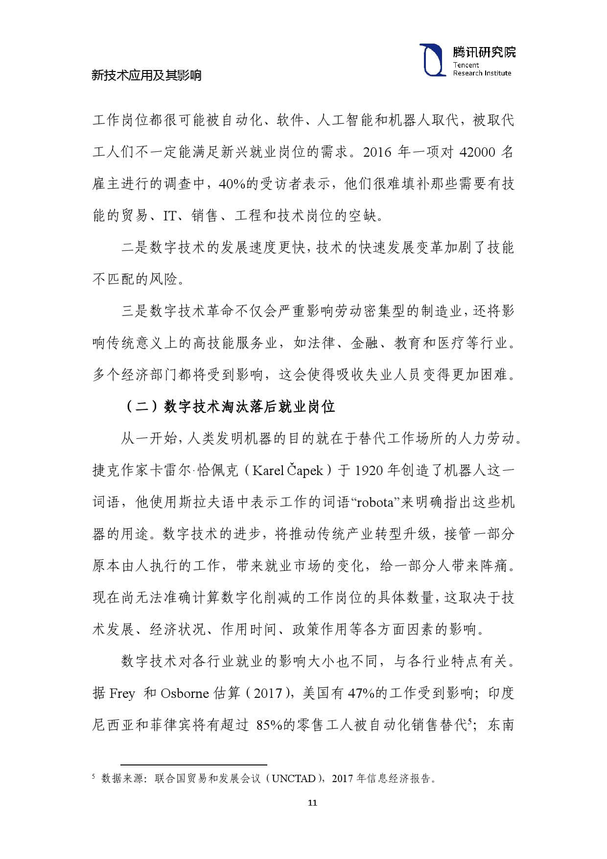 从一开始,人类发明机器的目的就在于替代工作场所的人力劳动。 捷克作家卡雷尔·恰佩克(Karel Čapek)于 1920 年创造了机器人这一 词语,他使用斯拉夫语中表示工作的词语“robota”来明确指出这些机 器的用途。数字技术的进步,将推动传统产业转型升级,接管一部分 原本由人执行的工作,带来就业市场的变化,给一部分人带来阵痛。 现在尚无法准确计算数字化削减的工作岗位的具体数量,这取决于技 术发展、经济状况、作用时间、政策作用等各方面因素的影响。