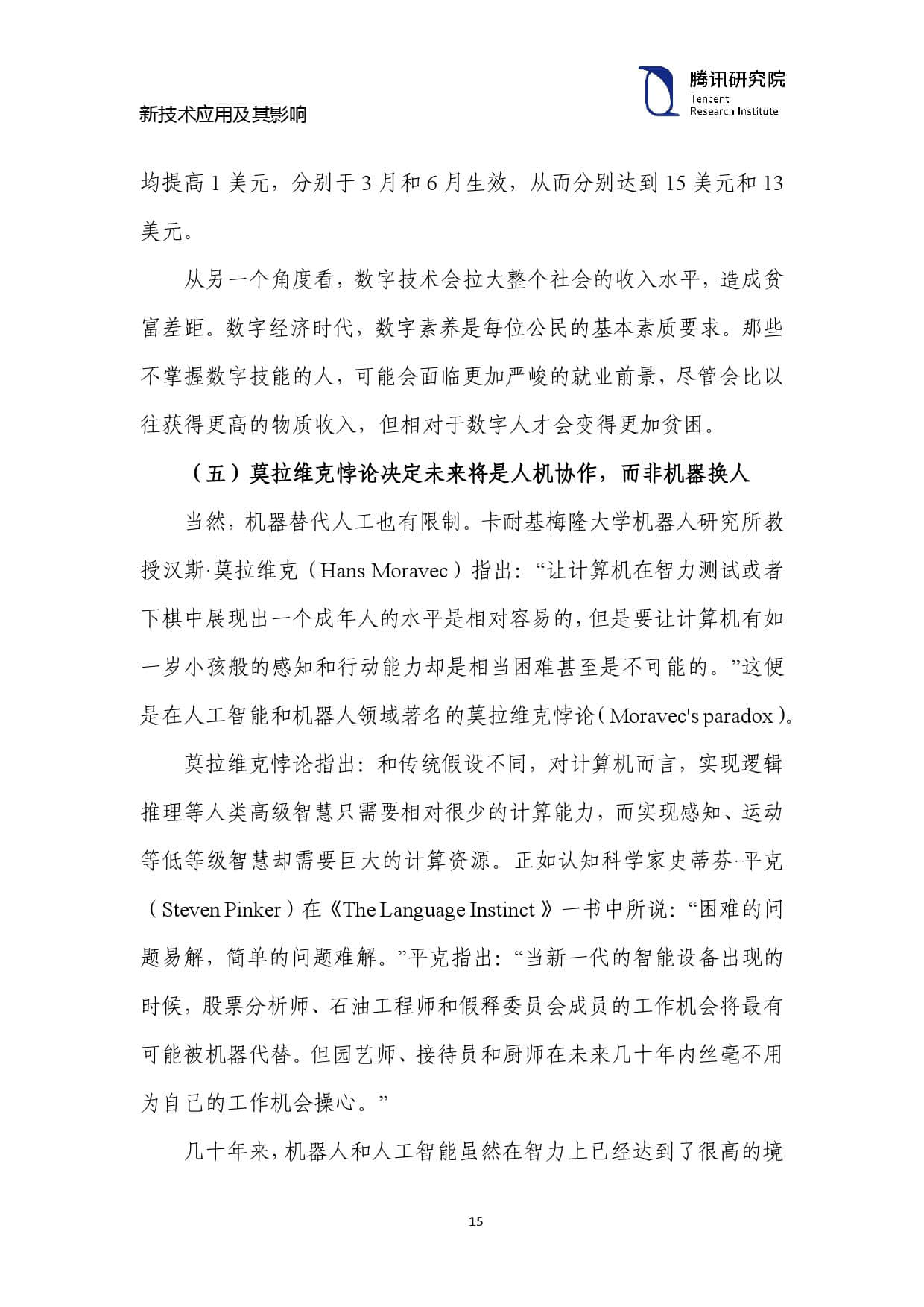 莫拉维克悖论指出:和传统假设不同,对计算机而言,实现逻辑 推理等人类高级智慧只需要相对很少的计算能力,而实现感知、运动 等低等级智慧却需要巨大的计算资源。正如认知科学家史蒂芬·平克(Steven Pinker)在《The Language Instinct 》一书中所说:“困难的问 题易解,简单的问题难解。”平克指出:“当新一代的智能设备出现的 时候,股票分析师、石油工程师和假释委员会成员的工作机会将最有 可能被机器代替。但园艺师、接待员和厨师在未来几十年内丝毫不用 为自己的工作机会操心。”