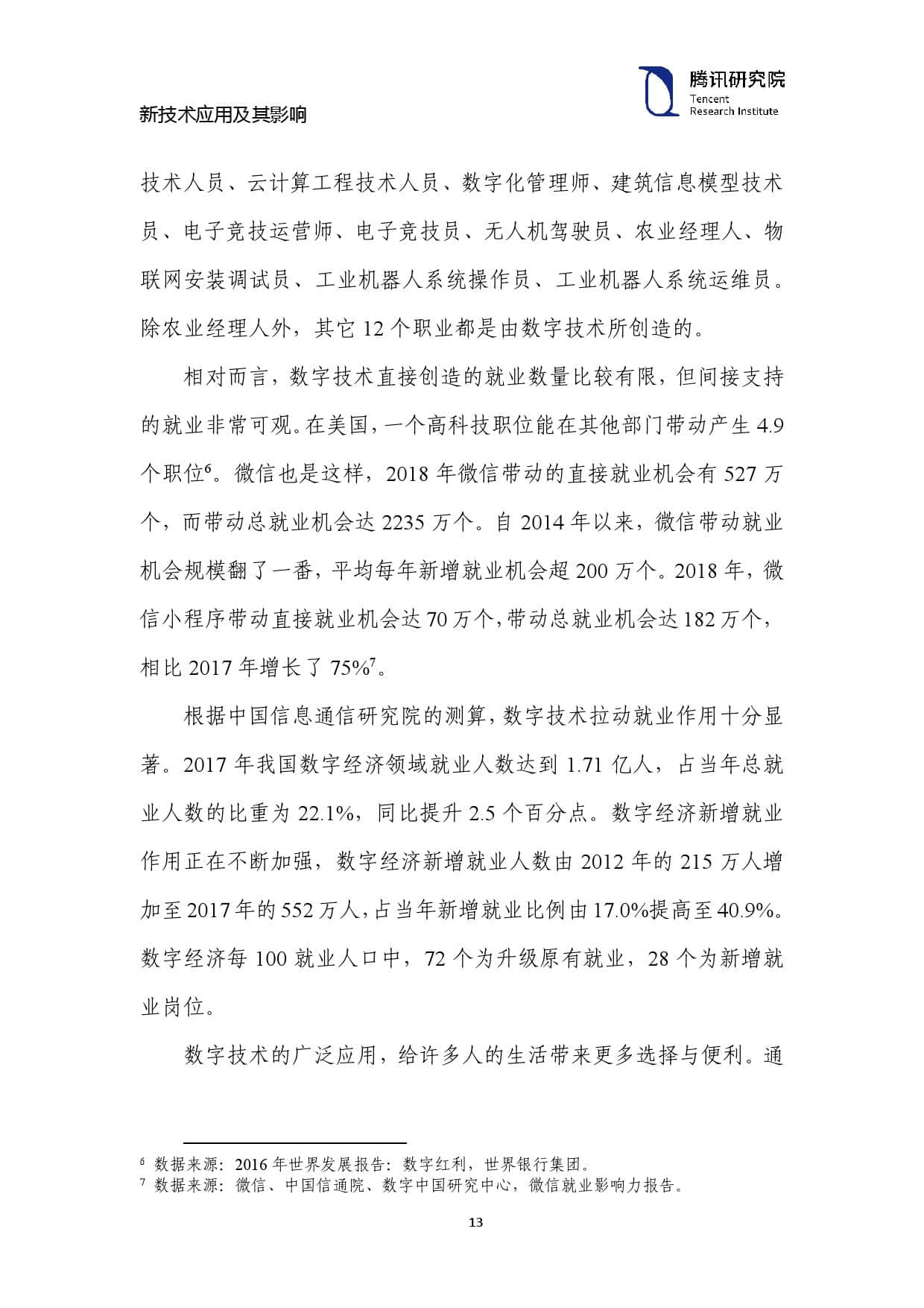 根据中国信息通信研究院的测算,数字技术拉动就业作用十分显 著。2017年我国数字经济领域就业人数达到1.71亿人,占当年总就 业人数的比重为22.1%,同比提升 2.5 个百分点。数字经济新增就业 作用正在不断加强,数字经济新增就业人数由2012年的 215 万人增 加至 2017 年的 552 万人,占当年新增就业比例由 17.0%提高至 40.9%。 数字经济每 100 就业人口中,72 个为升级原有就业,28 个为新增就 业岗位。