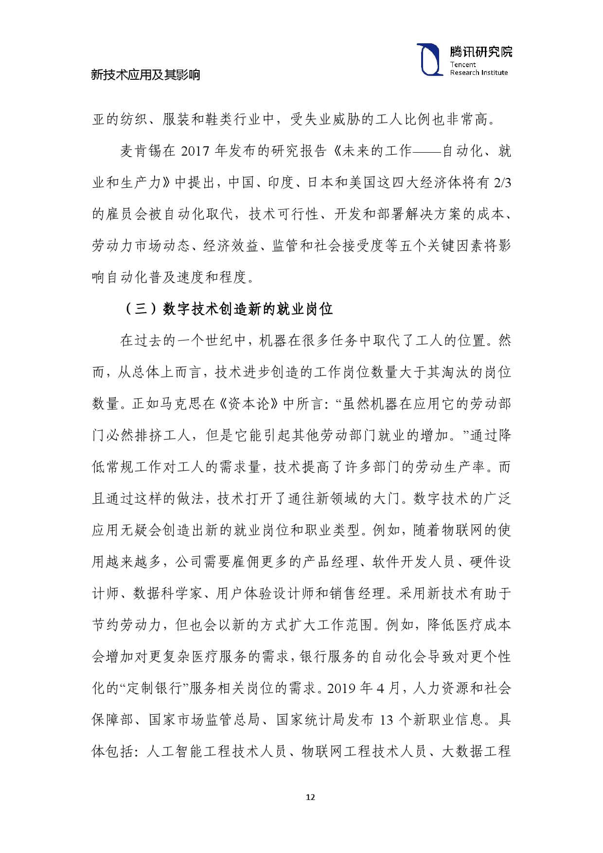 在过去的一个世纪中,机器在很多任务中取代了工人的位置。然 而,从总体上而言,技术进步创造的工作岗位数量大于其淘汰的岗位 数量。正如马克思在《资本论》中所言:“虽然机器在应用它的劳动部 门必然排挤工人,但是它能引起其他劳动部门就业的增加。”通过降 低常规工作对工人的需求量,技术提高了许多部门的劳动生产率。而 且通过这样的做法,技术打开了通往新领域的大门。数字技术的广泛 应用无疑会创造出新的就业岗位和职业类型。例如,随着物联网的使 用越来越多,公司需要雇佣更多的产品经理、软件开发人员、硬件设 计师、数据科学家、用户体验设计师和销售经理。采用新技术有助于 节约劳动力,但也会以新的方式扩大工作范围。例如,降低医疗成本 会增加对更复杂医疗服务的需求,银行服务的自动化会导致对更个性 化的“定制银行”服务相关岗位的需求。2019 年 4 月,人力资源和社会 保障部、国家市场监管总局、国家统计局发布13个新职业信息。具 体包括:人工智能工程技术人员、物联网工程技术人员、大数据工程技术人员、云计算工程技术人员、数字化管理师、建筑信息模型技术 员、电子竞技运营师、电子竞技员、无人机驾驶员、农业经理人、物 联网安装调试员、工业机器人系统操作员、工业机器人系统运维员。 除农业经理人外,其它 12 个职业都是由数字技术所创造的。